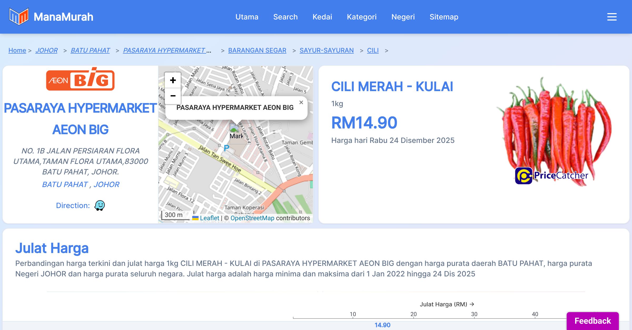 Harga purata tahunan 1kg CILI MERAH - KULAI di PASARAYA HYPERMARKET AEON BIG berbanding harga purata daerah BATU PAHAT, harga purata Negeri JOHOR dan harga purata seluruh negara