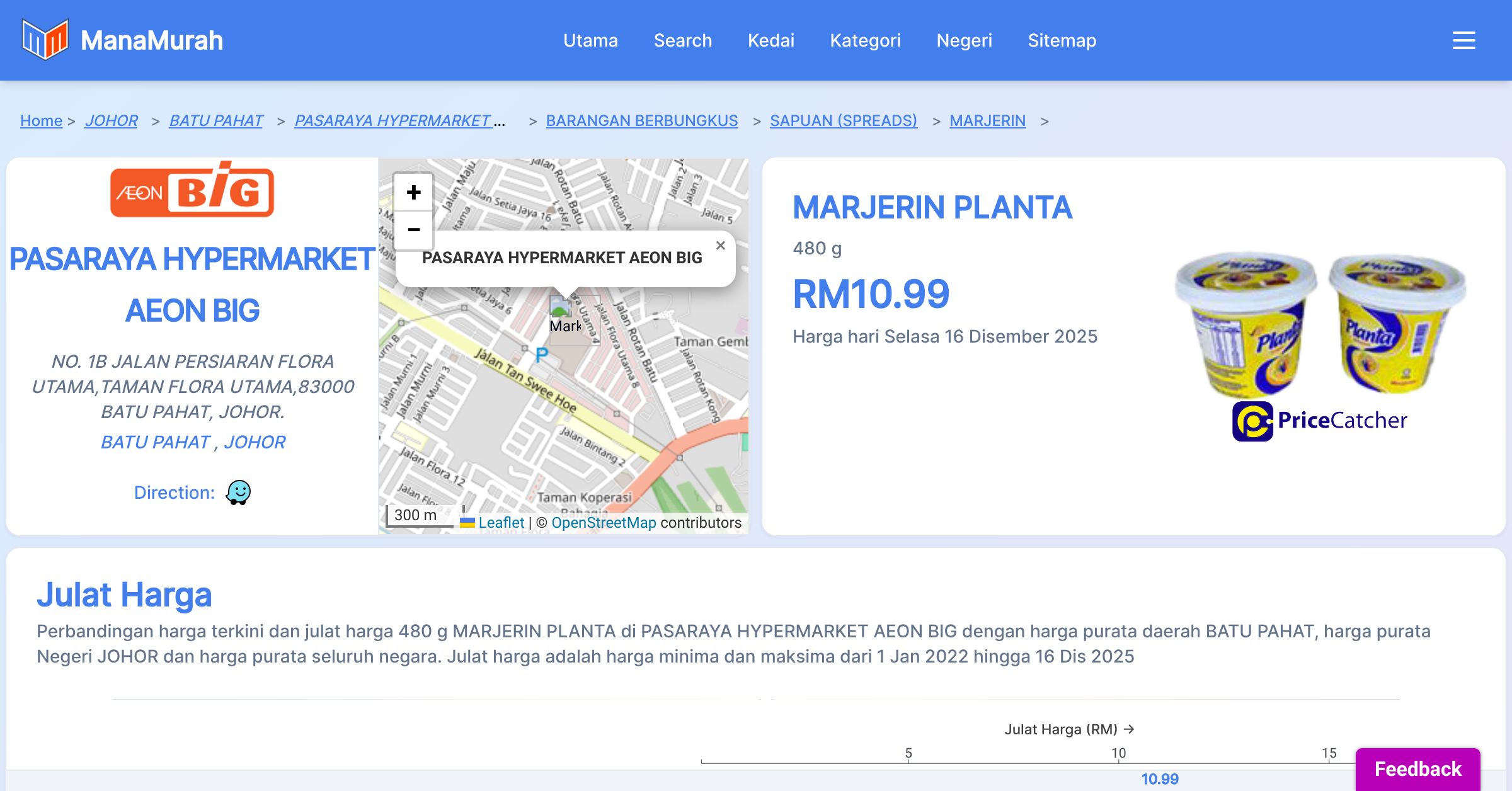 Perubahan harga purata mingguan 480 g MARJERIN PLANTA di PASARAYA HYPERMARKET AEON BIG berbanding harga purata mingguan daerah BATU PAHAT, harga purata mingguan negeri JOHOR dan harga purata mingguan seluruh negara sehingga 16 Dis 2025
