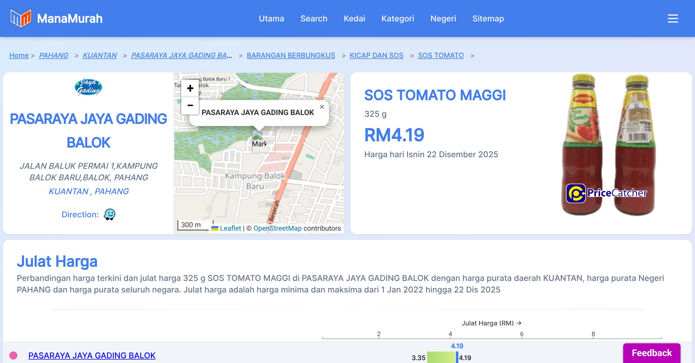 Perubahan harga purata mingguan 325 g SOS TOMATO MAGGI di PASARAYA JAYA GADING BALOK berbanding harga purata mingguan daerah KUANTAN, harga purata mingguan negeri PAHANG dan harga purata mingguan seluruh negara sehingga 22 Dis 2025