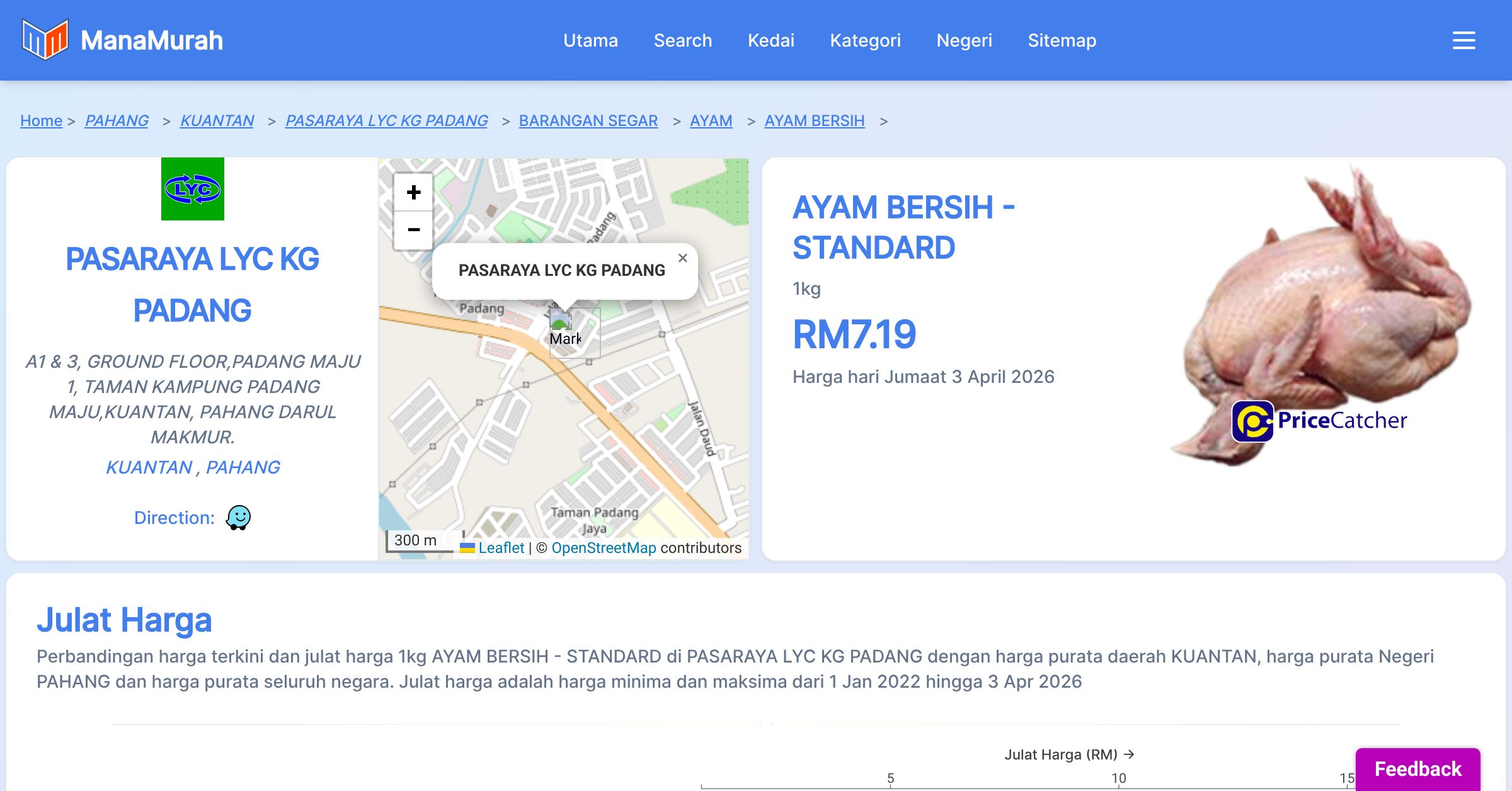 Harga purata tahunan 1kg AYAM BERSIH - STANDARD di PASARAYA LYC KG PADANG berbanding harga purata daerah KUANTAN, harga purata Negeri PAHANG dan harga purata seluruh negara