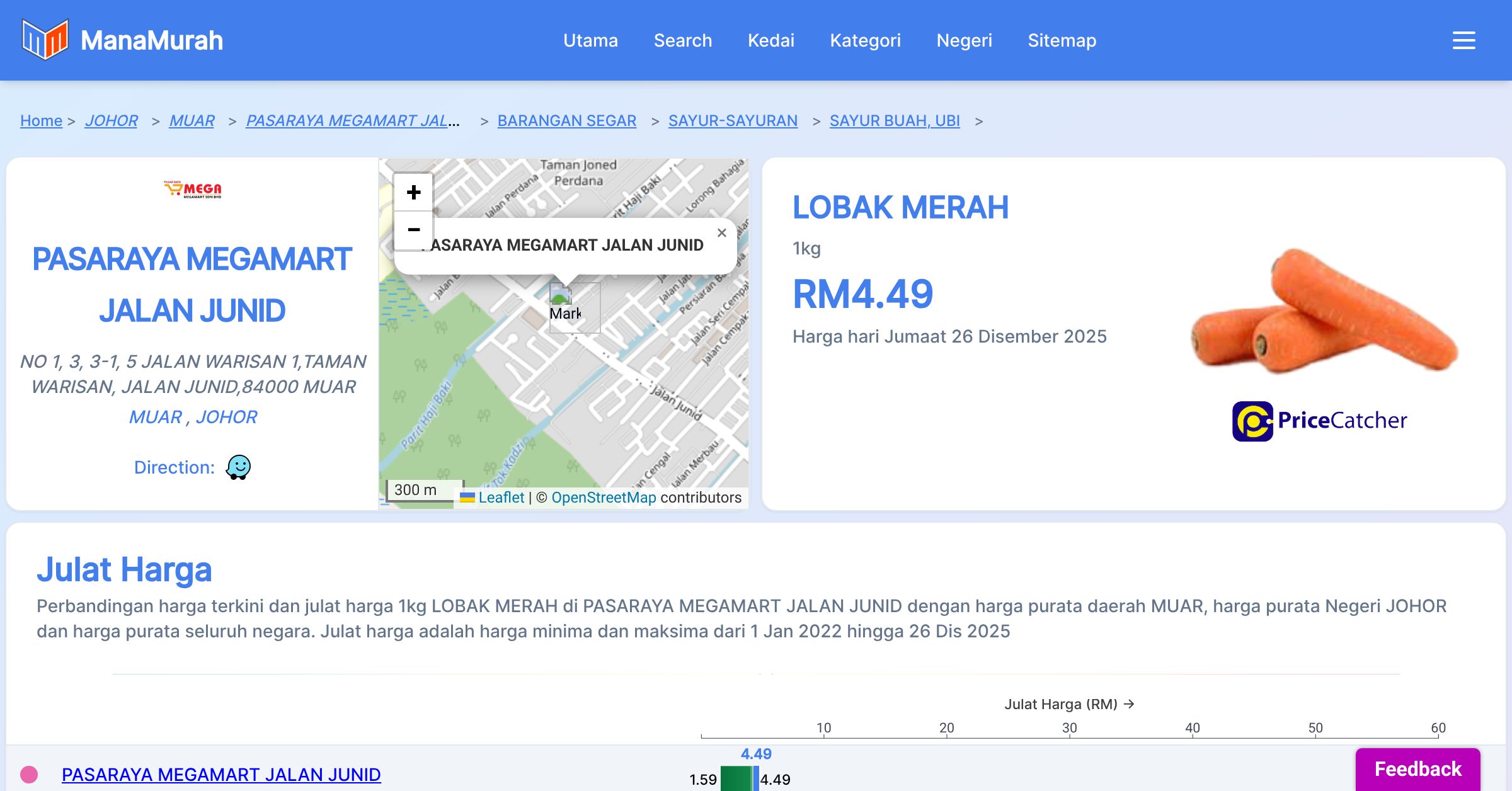 Harga purata mingguan 1kg LOBAK MERAH di PASARAYA MEGAMART JALAN JUNID berbanding harga purata daerah MUAR, harga purata Negeri JOHOR dan harga purata seluruh negara