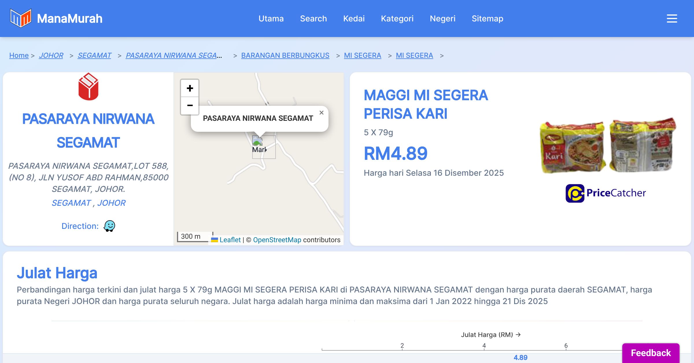 Perubahan harga purata mingguan 5 X 79g MAGGI MI SEGERA PERISA KARI di PASARAYA NIRWANA SEGAMAT berbanding harga purata mingguan daerah SEGAMAT, harga purata mingguan negeri JOHOR dan harga purata mingguan seluruh negara sehingga 21 Dis 2025