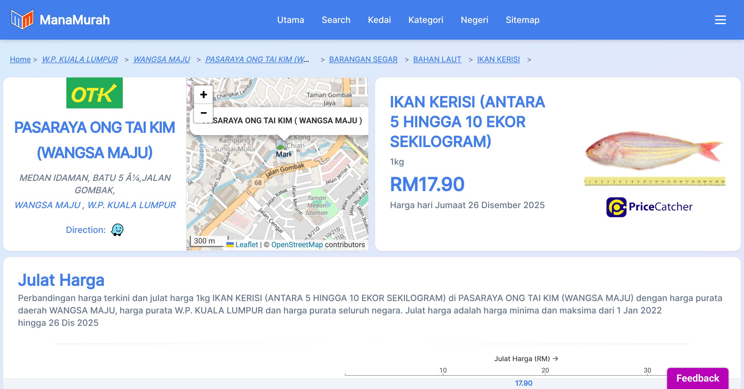 Perbandingan harga terkini dan julat harga 1kg IKAN KERISI (ANTARA 5 HINGGA 10 EKOR SEKILOGRAM) di PASARAYA ONG TAI KIM (WANGSA MAJU) dengan harga purata daerah WANGSA MAJU, harga purata W.P. KUALA LUMPUR dan harga purata seluruh negara. Julat harga adalah harga minima dan maksima dari 1 Jan 2022 hingga 26 Dis 2025