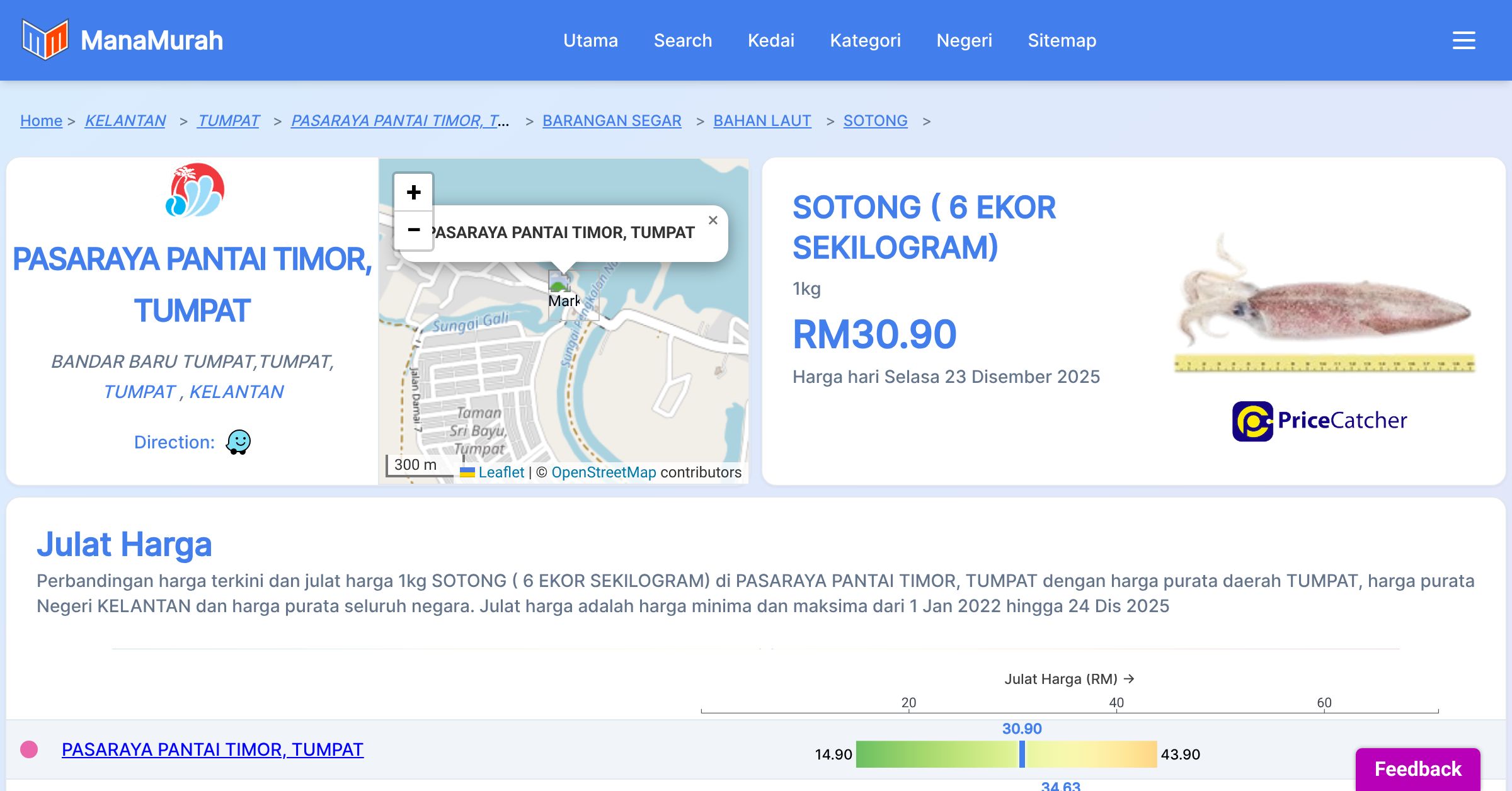 Perbandingan harga terkini dan julat harga 1kg SOTONG ( 6 EKOR SEKILOGRAM) di PASARAYA PANTAI TIMOR, TUMPAT dengan harga purata daerah TUMPAT, harga purata Negeri KELANTAN dan harga purata seluruh negara. Julat harga adalah harga minima dan maksima dari 1 Jan 2022 hingga 24 Dis 2025