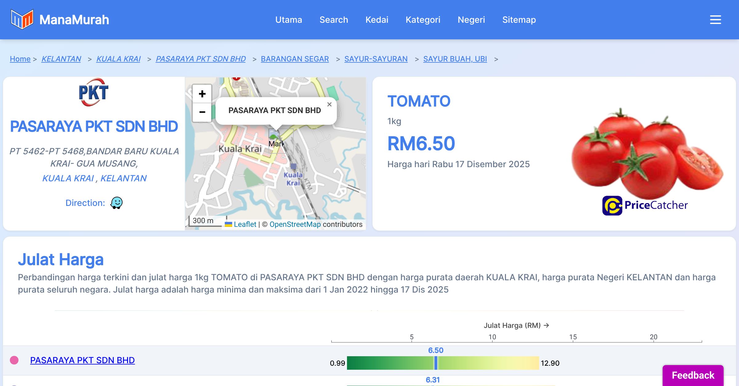 Perbandingan harga terkini dan julat harga 1kg TOMATO di PASARAYA PKT SDN BHD dengan harga purata daerah KUALA KRAI, harga purata Negeri KELANTAN dan harga purata seluruh negara. Julat harga adalah harga minima dan maksima dari 1 Jan 2022 hingga 17 Dis 2025