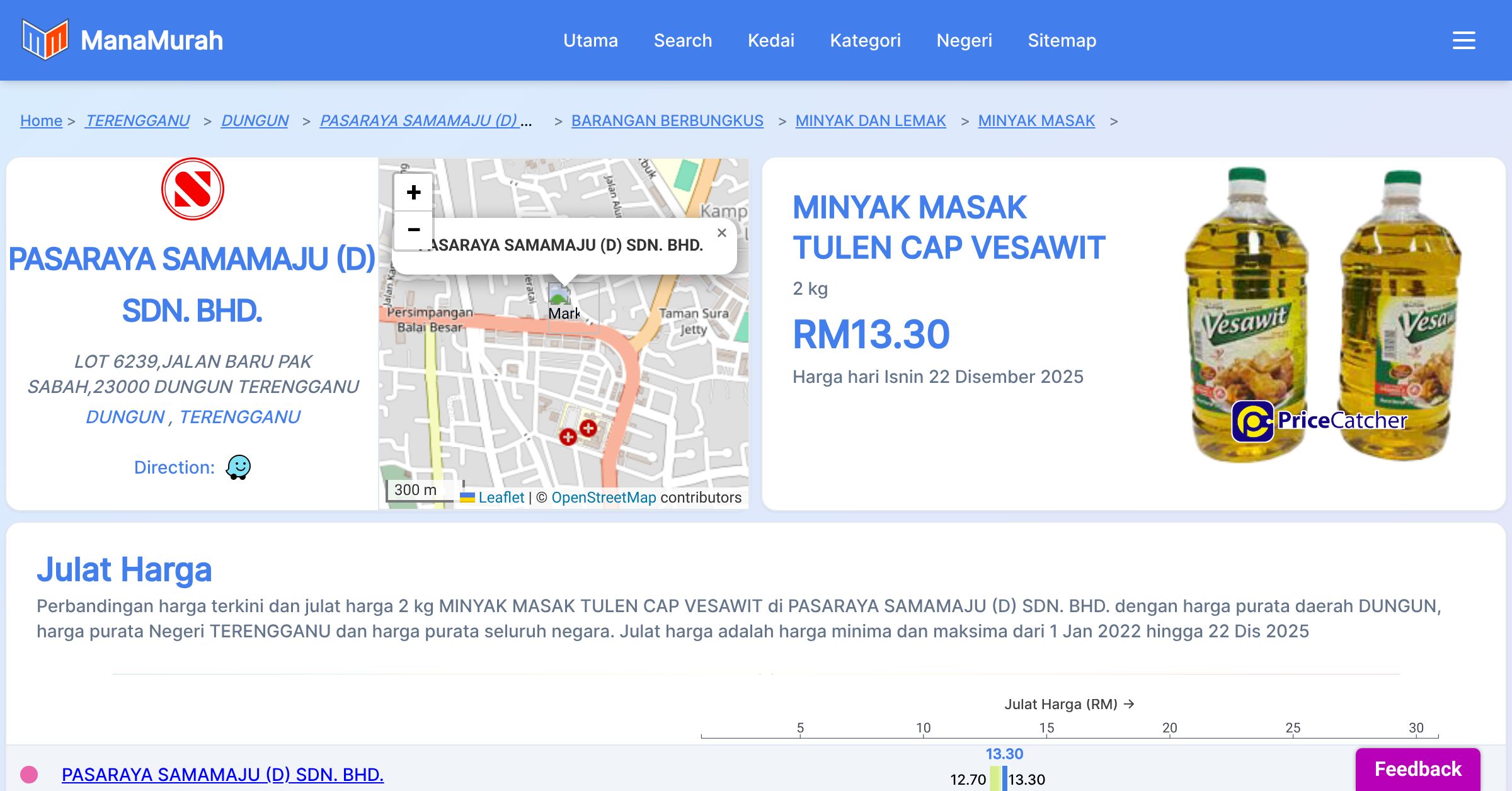 Perbandingan harga terkini dan julat harga 2 kg MINYAK MASAK TULEN CAP VESAWIT di PASARAYA SAMAMAJU (D) SDN. BHD. dengan harga purata daerah DUNGUN, harga purata Negeri TERENGGANU dan harga purata seluruh negara. Julat harga adalah harga minima dan maksima dari 1 Jan 2022 hingga 22 Dis 2025