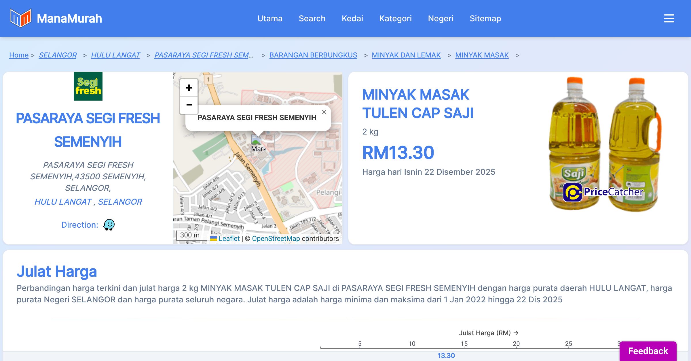 Perubahan harga purata mingguan 2 kg MINYAK MASAK TULEN CAP SAJI di PASARAYA SEGI FRESH SEMENYIH berbanding harga purata mingguan daerah HULU LANGAT, harga purata mingguan negeri SELANGOR dan harga purata mingguan seluruh negara sehingga 22 Dis 2025