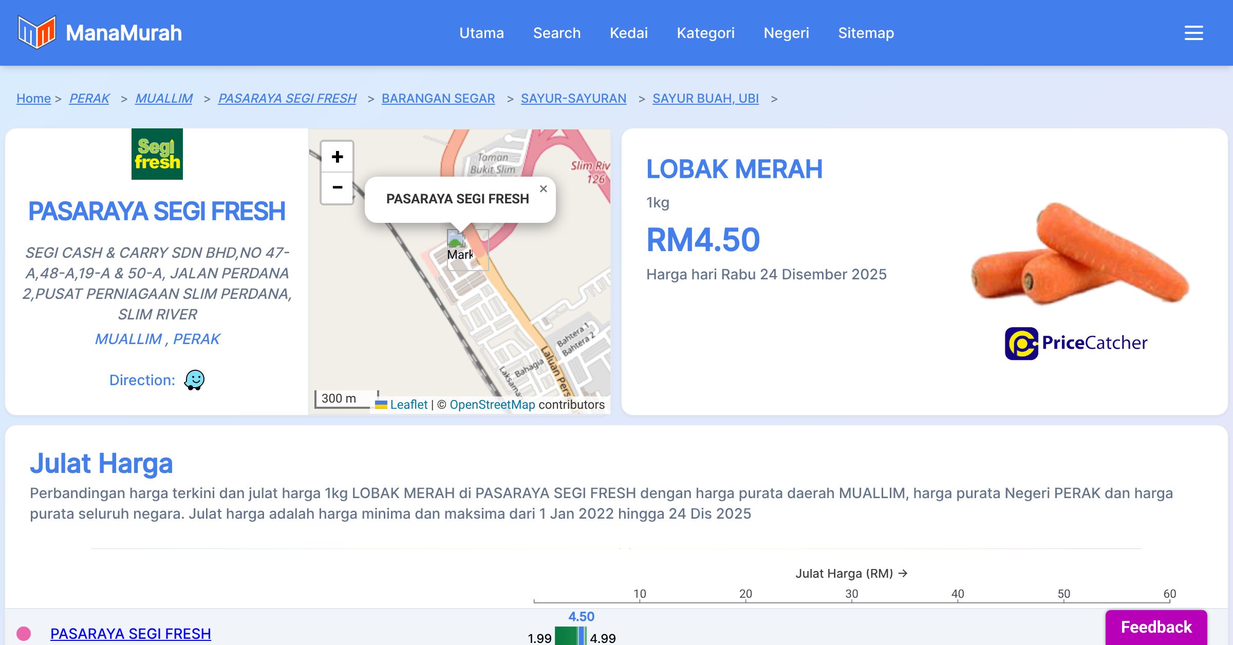 Perubahan harga purata mingguan 1kg LOBAK MERAH di PASARAYA SEGI FRESH berbanding harga purata mingguan daerah MUALLIM, harga purata mingguan negeri PERAK dan harga purata mingguan seluruh negara sehingga 24 Dis 2025