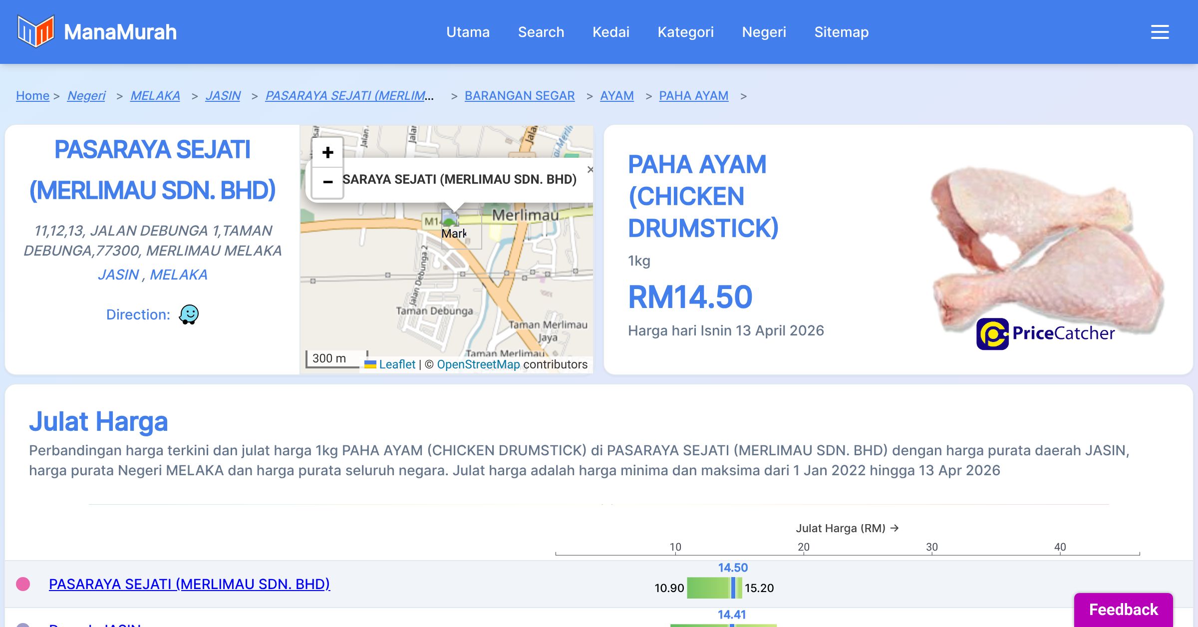 Perbandingan harga terkini dan julat harga 1kg PAHA AYAM (CHICKEN DRUMSTICK) di PASARAYA SEJATI (MERLIMAU SDN. BHD) dengan harga purata daerah JASIN, harga purata Negeri MELAKA dan harga purata seluruh negara. Julat harga adalah harga minima dan maksima dari 1 Jan 2022 hingga 13 Apr 2026