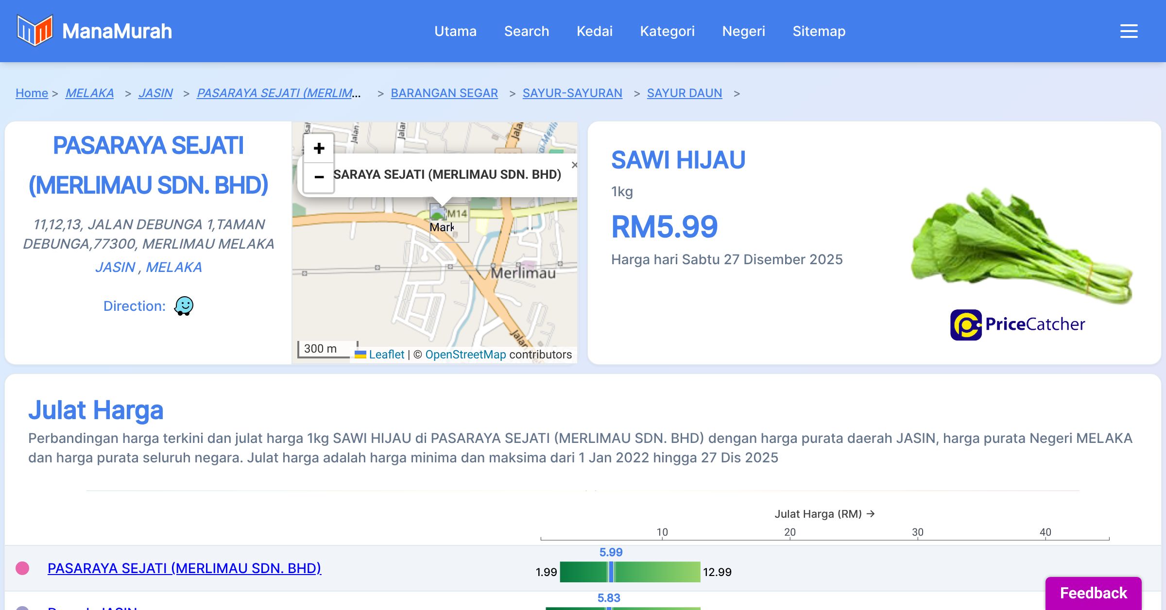 Perbandingan harga terkini dan julat harga 1kg SAWI HIJAU di PASARAYA SEJATI (MERLIMAU SDN. BHD) dengan harga purata daerah JASIN, harga purata Negeri MELAKA dan harga purata seluruh negara. Julat harga adalah harga minima dan maksima dari 1 Jan 2022 hingga 27 Dis 2025