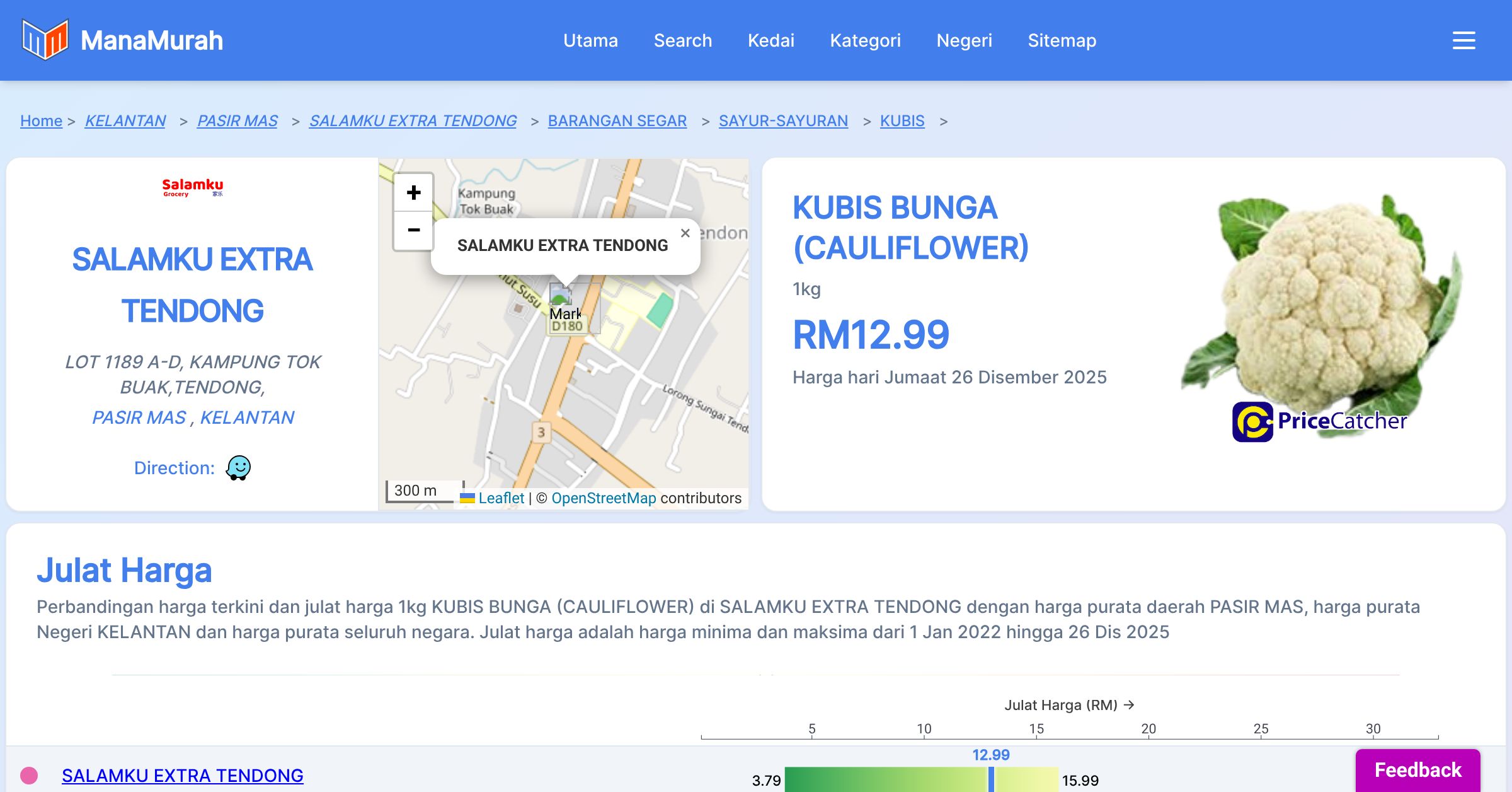 Perbandingan harga terkini dan julat harga 1kg KUBIS BUNGA (CAULIFLOWER) di SALAMKU EXTRA TENDONG dengan harga purata daerah PASIR MAS, harga purata Negeri KELANTAN dan harga purata seluruh negara. Julat harga adalah harga minima dan maksima dari 1 Jan 2022 hingga 26 Dis 2025