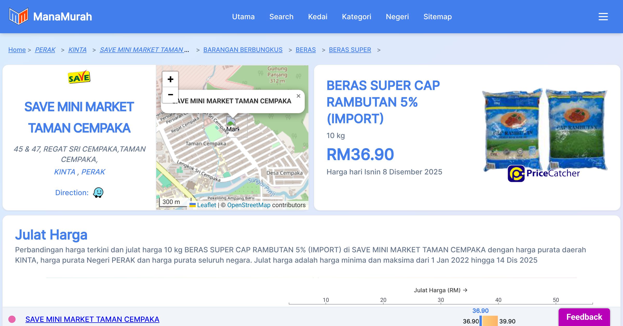 Perubahan harga purata mingguan 10 kg BERAS SUPER CAP RAMBUTAN 5% (IMPORT) di SAVE MINI MARKET TAMAN CEMPAKA berbanding harga purata mingguan daerah KINTA, harga purata mingguan negeri PERAK dan harga purata mingguan seluruh negara sehingga 14 Dis 2025