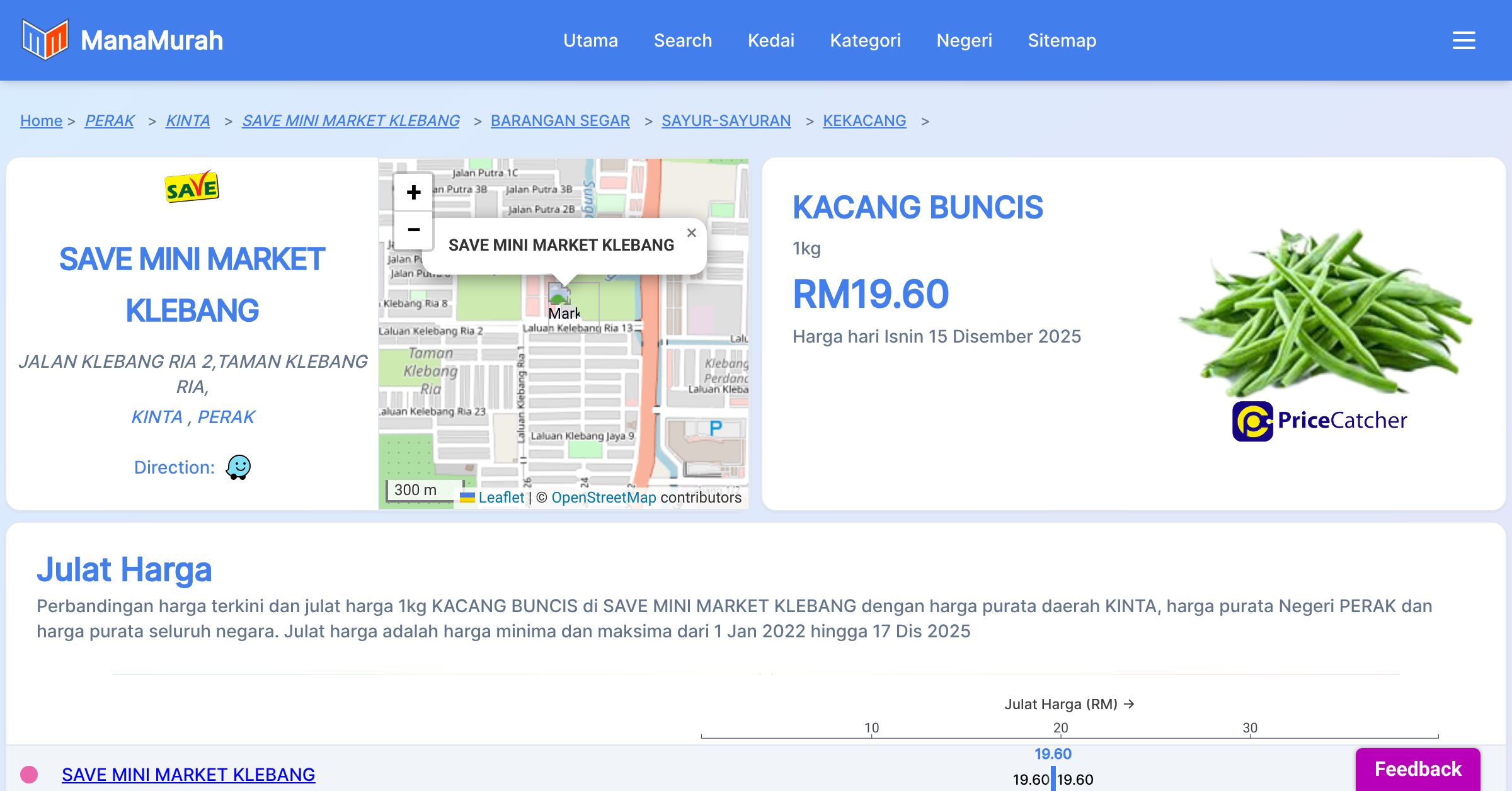 Perbandingan harga terkini dan julat harga 1kg KACANG BUNCIS di SAVE MINI MARKET KLEBANG dengan harga purata daerah KINTA, harga purata Negeri PERAK dan harga purata seluruh negara. Julat harga adalah harga minima dan maksima dari 1 Jan 2022 hingga 17 Dis 2025