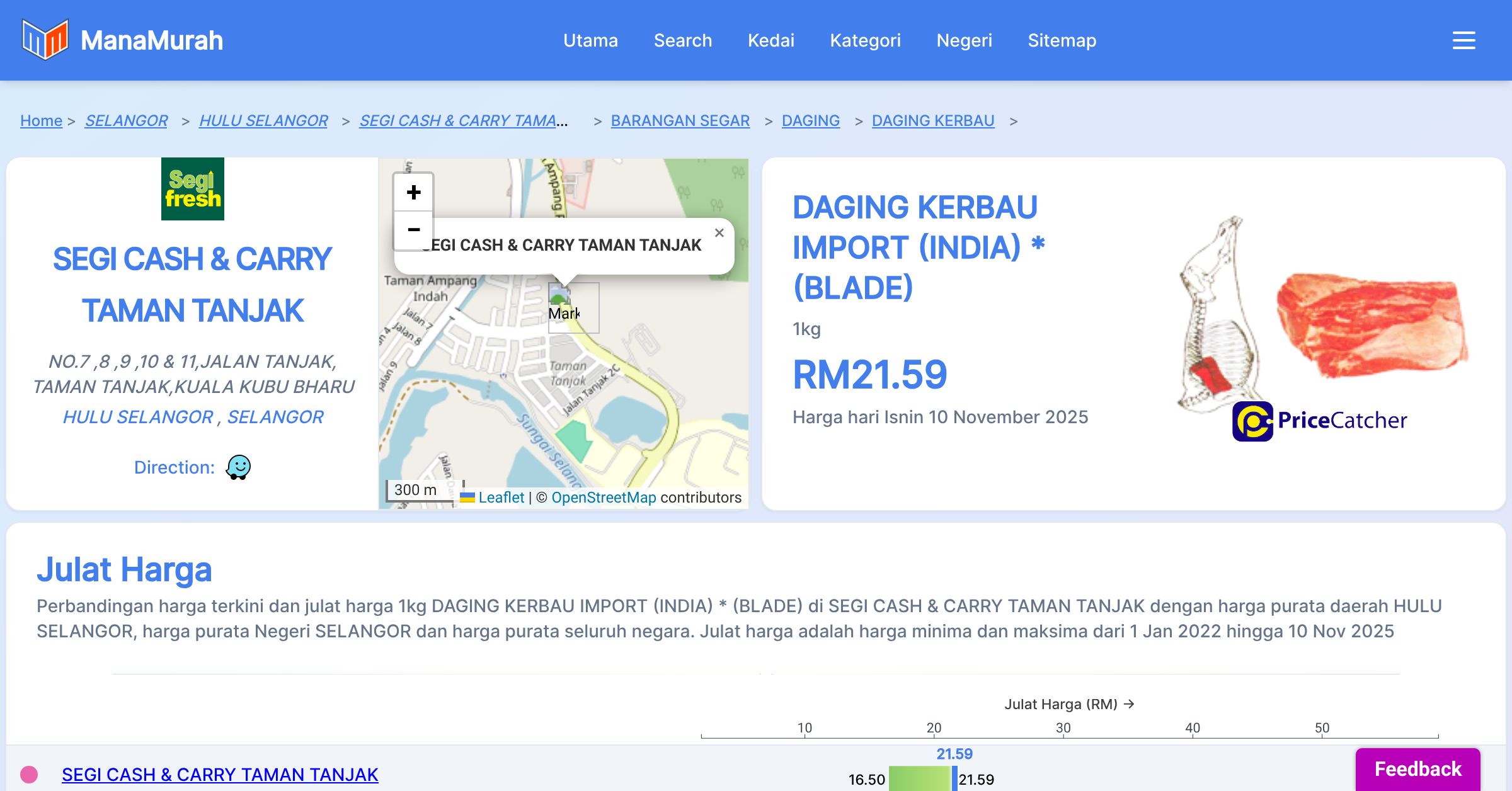 Harga purata bulanan 1kg DAGING KERBAU IMPORT (INDIA) * (BLADE) di SEGI CASH & CARRY TAMAN TANJAK berbanding harga purata daerah HULU SELANGOR, harga purata Negeri SELANGOR dan harga purata seluruh negara