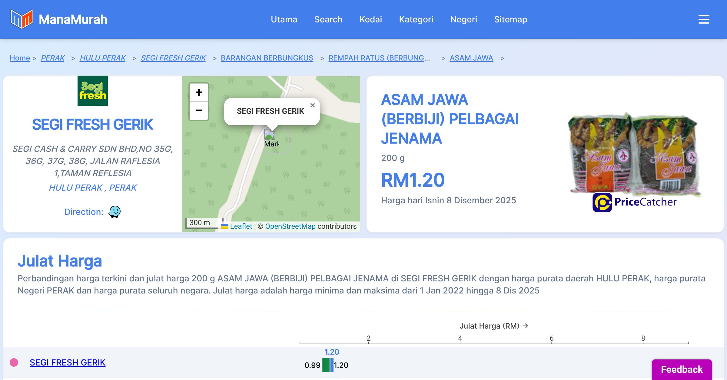 Perubahan harga purata mingguan 200 g ASAM JAWA (BERBIJI) PELBAGAI JENAMA di SEGI FRESH GERIK berbanding harga purata mingguan daerah HULU PERAK, harga purata mingguan negeri PERAK dan harga purata mingguan seluruh negara sehingga 8 Dis 2025