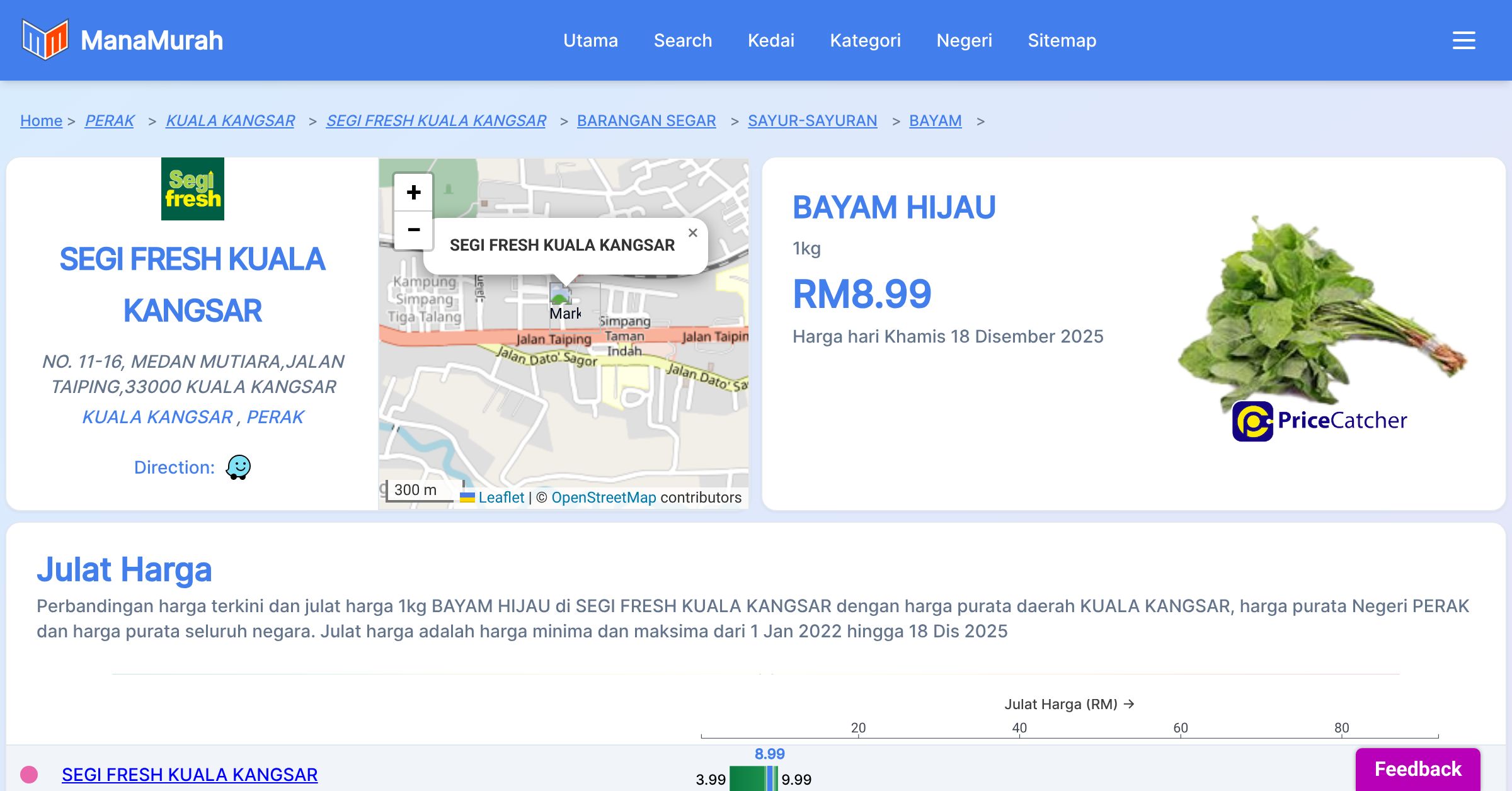 Perbandingan harga terkini dan julat harga 1kg BAYAM HIJAU di SEGI FRESH KUALA KANGSAR dengan harga purata daerah KUALA KANGSAR, harga purata Negeri PERAK dan harga purata seluruh negara. Julat harga adalah harga minima dan maksima dari 1 Jan 2022 hingga 18 Dis 2025