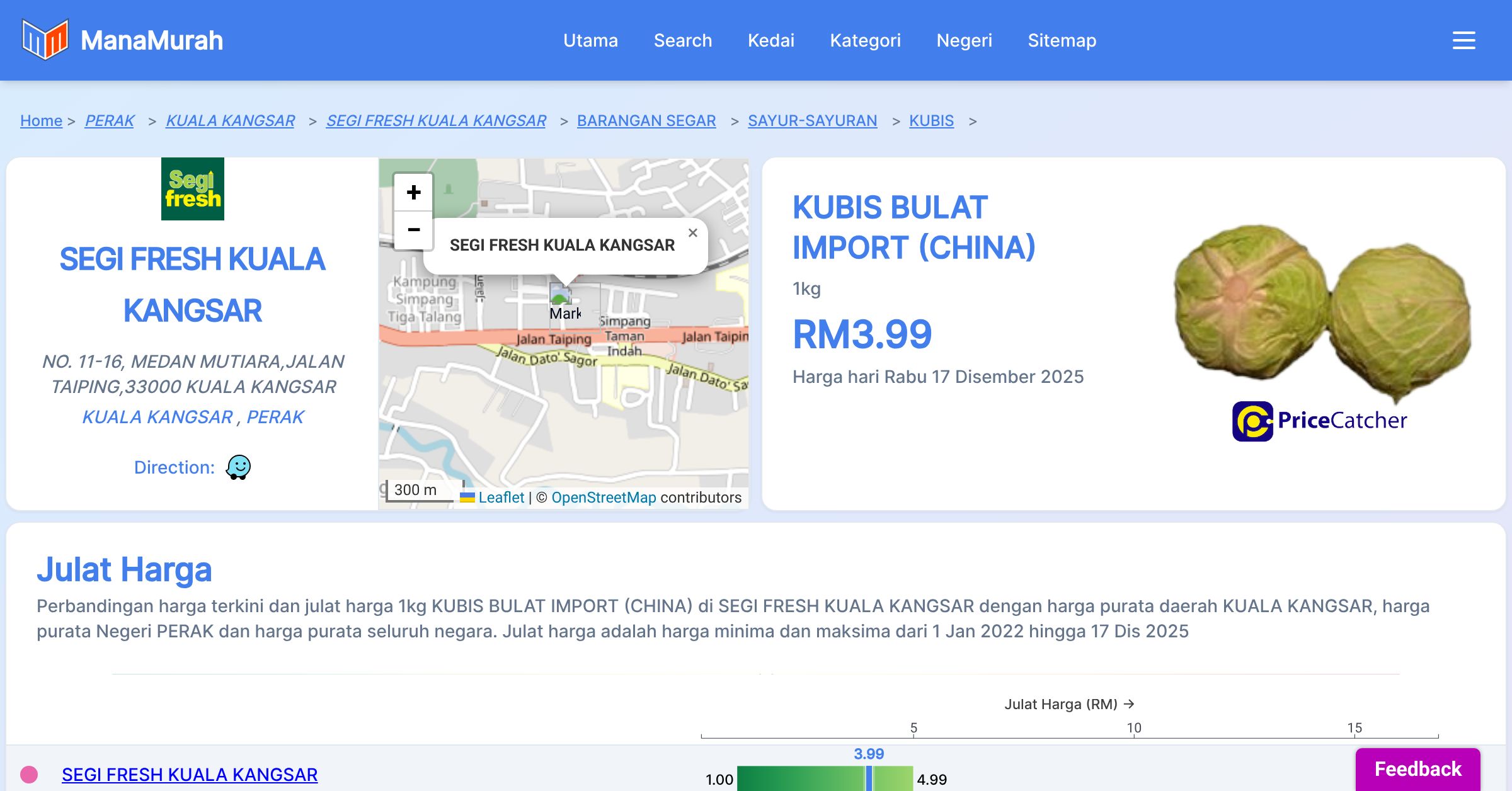 Perbandingan harga terkini dan julat harga 1kg KUBIS BULAT IMPORT (CHINA) di SEGI FRESH KUALA KANGSAR dengan harga purata daerah KUALA KANGSAR, harga purata Negeri PERAK dan harga purata seluruh negara. Julat harga adalah harga minima dan maksima dari 1 Jan 2022 hingga 17 Dis 2025