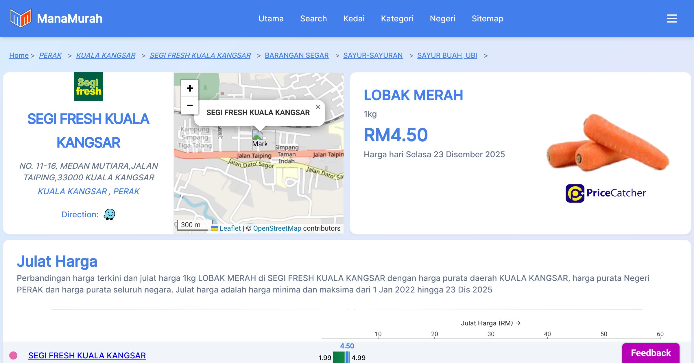 Perubahan harga purata mingguan 1kg LOBAK MERAH di SEGI FRESH KUALA KANGSAR berbanding harga purata mingguan daerah KUALA KANGSAR, harga purata mingguan negeri PERAK dan harga purata mingguan seluruh negara sehingga 23 Dis 2025
