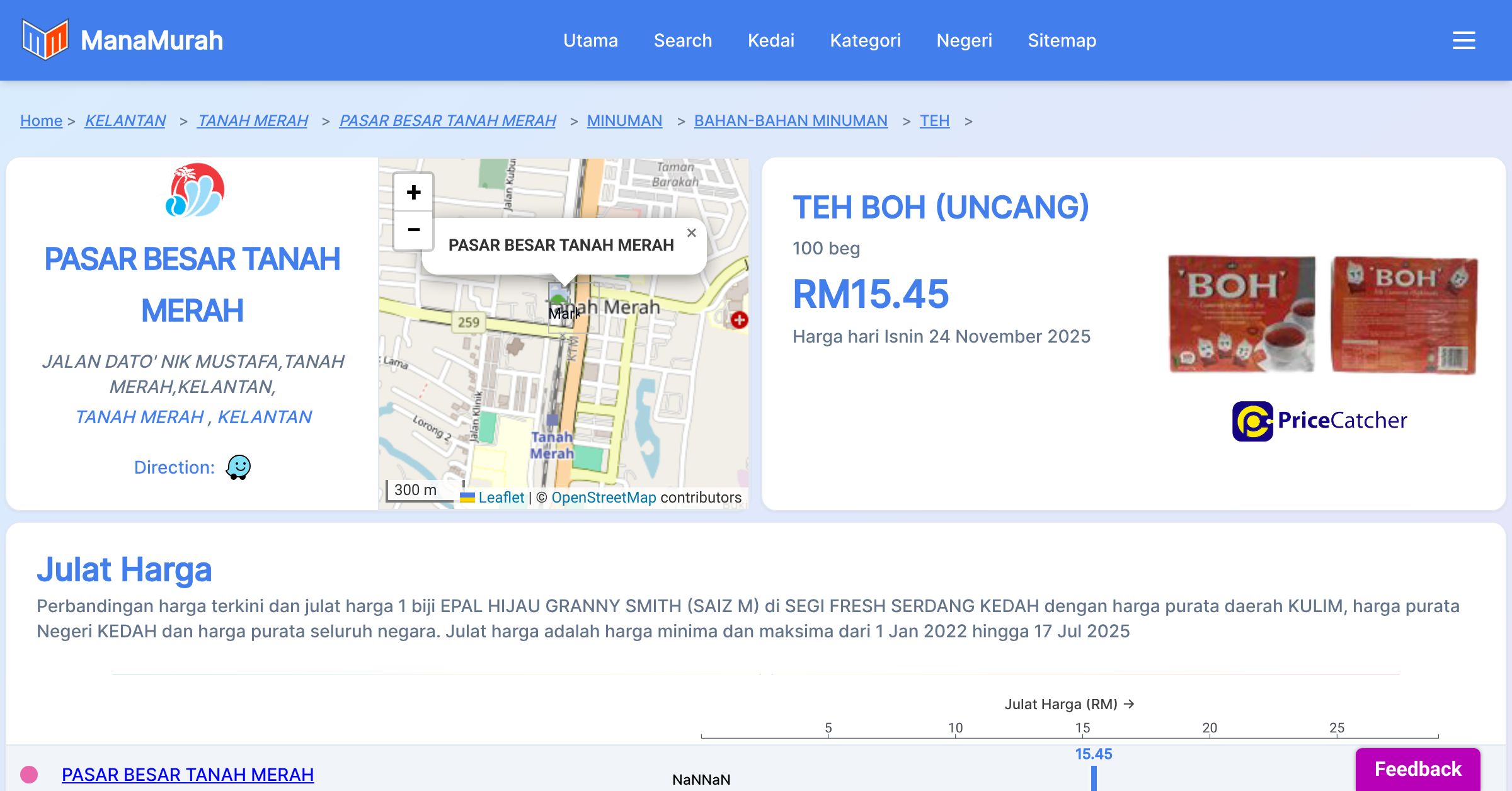 Perbandingan harga terkini dan julat harga 1 biji EPAL HIJAU GRANNY SMITH (SAIZ M) di SEGI FRESH SERDANG KEDAH dengan harga purata daerah KULIM, harga purata Negeri KEDAH dan harga purata seluruh negara. Julat harga adalah harga minima dan maksima dari 1 Jan 2022 hingga 17 Jul 2025