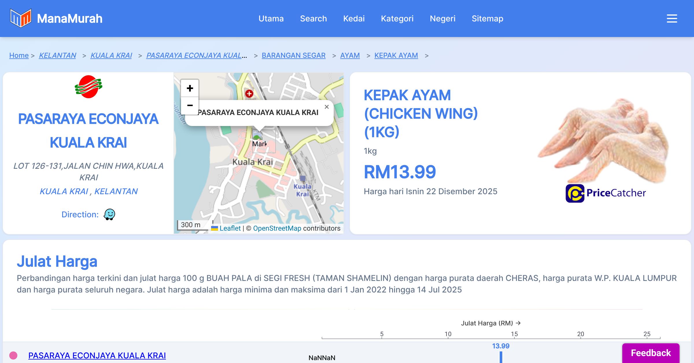 Tiada maklumat harga KEPAK AYAM (CHICKEN WING) (1KG) di Daerah KUALA KRAI pada minggu ke-52 tahun 2025 dari 22 Disember 2025