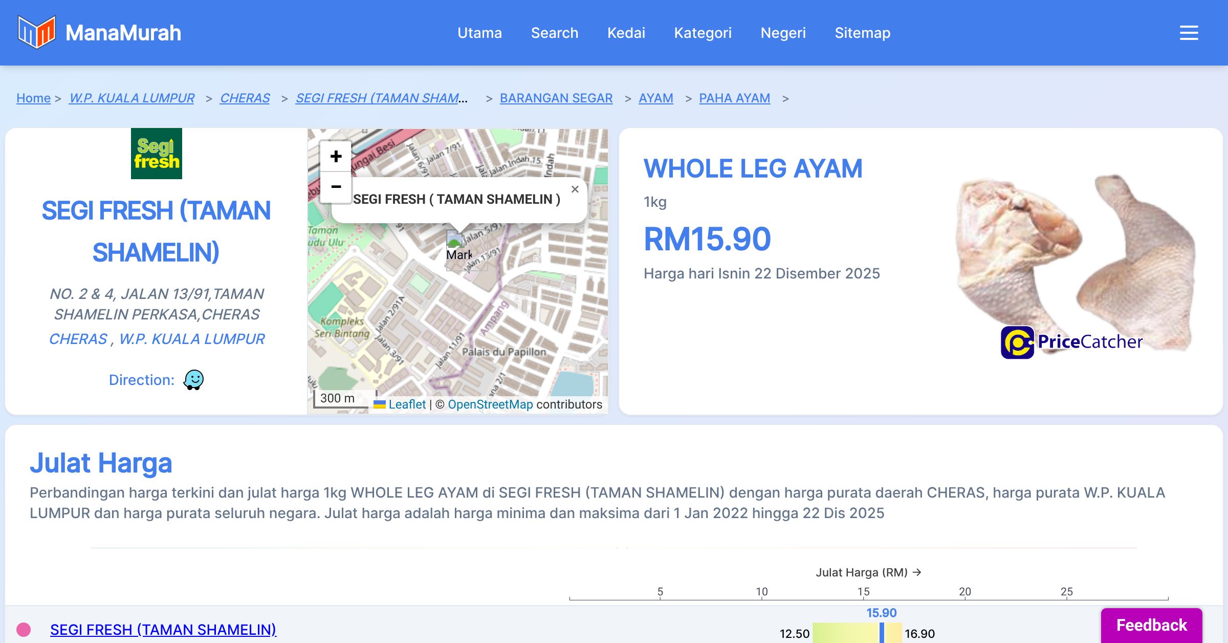 Perubahan harga purata mingguan 1kg WHOLE LEG AYAM di SEGI FRESH ( TAMAN SHAMELIN ) berbanding harga purata mingguan daerah CHERAS, harga purata mingguan negeri W.P. KUALA LUMPUR dan harga purata mingguan seluruh negara sehingga 22 Dis 2025