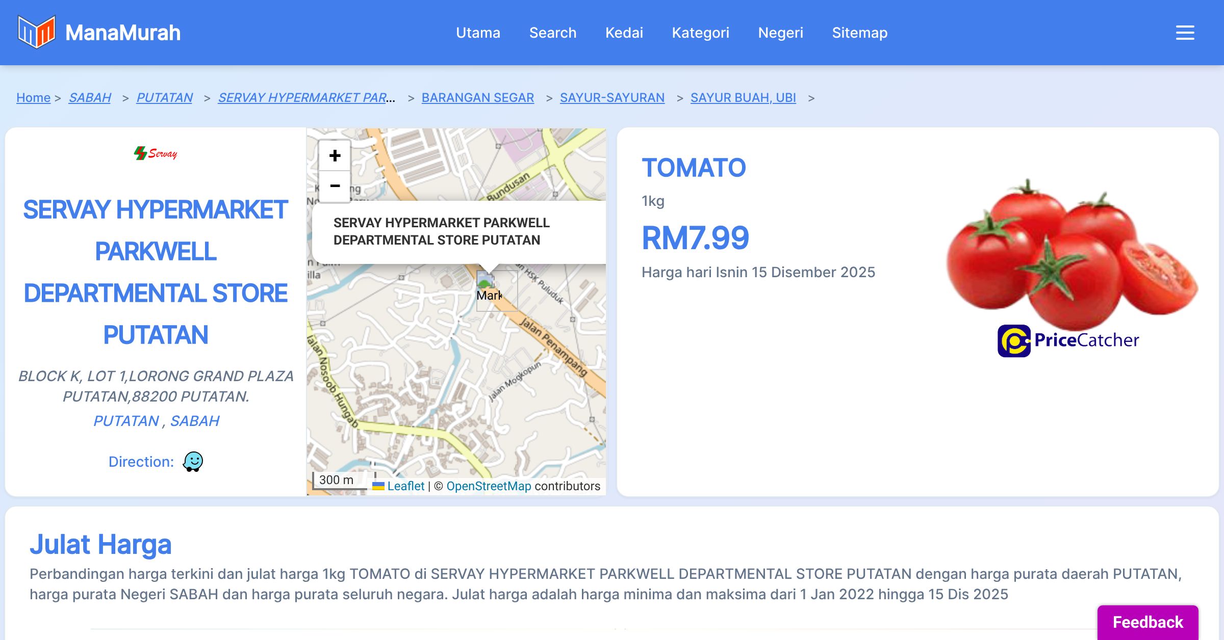 Harga purata tahunan 1kg TOMATO di SERVAY HYPERMARKET PARKWELL DEPARTMENTAL STORE PUTATAN berbanding harga purata daerah PUTATAN, harga purata Negeri SABAH dan harga purata seluruh negara