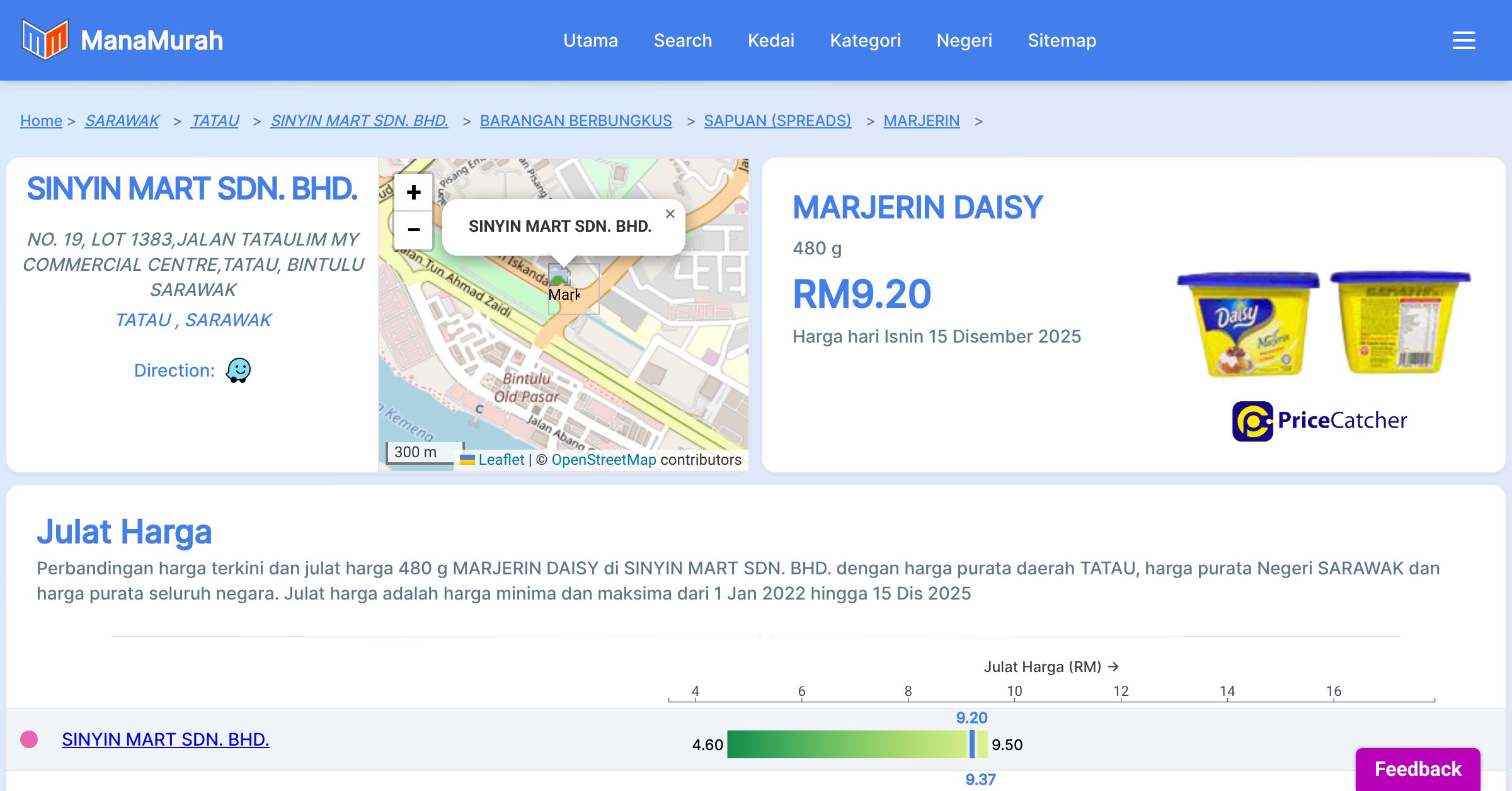 Perbandingan harga terkini dan julat harga 480 g MARJERIN DAISY di SINYIN MART SDN. BHD. dengan harga purata daerah TATAU, harga purata Negeri SARAWAK dan harga purata seluruh negara. Julat harga adalah harga minima dan maksima dari 1 Jan 2022 hingga 8 Dis 2025