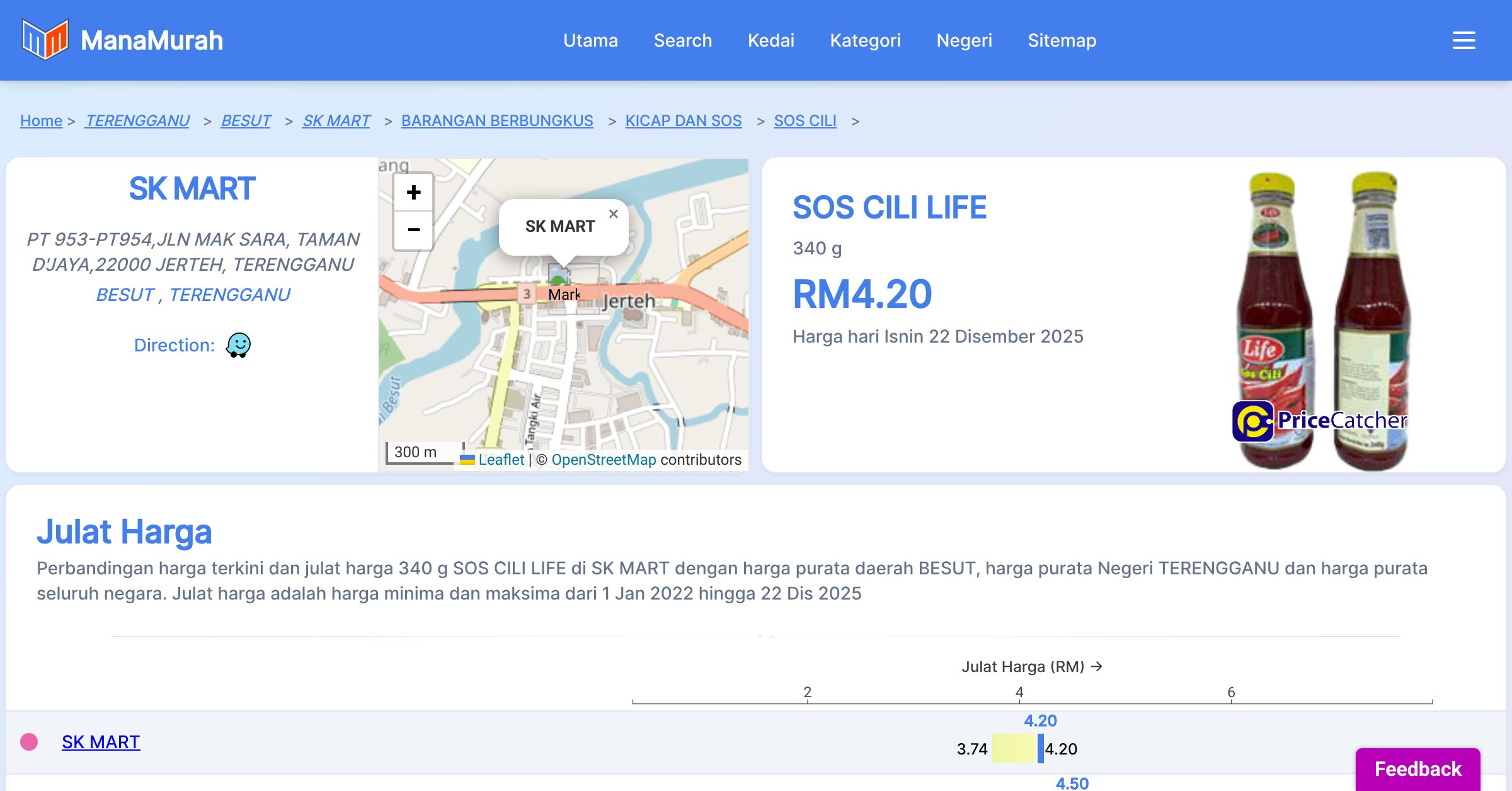 Perubahan harga purata mingguan 340 g SOS CILI LIFE di SK MART berbanding harga purata mingguan daerah BESUT, harga purata mingguan negeri TERENGGANU dan harga purata mingguan seluruh negara sehingga 22 Dis 2025