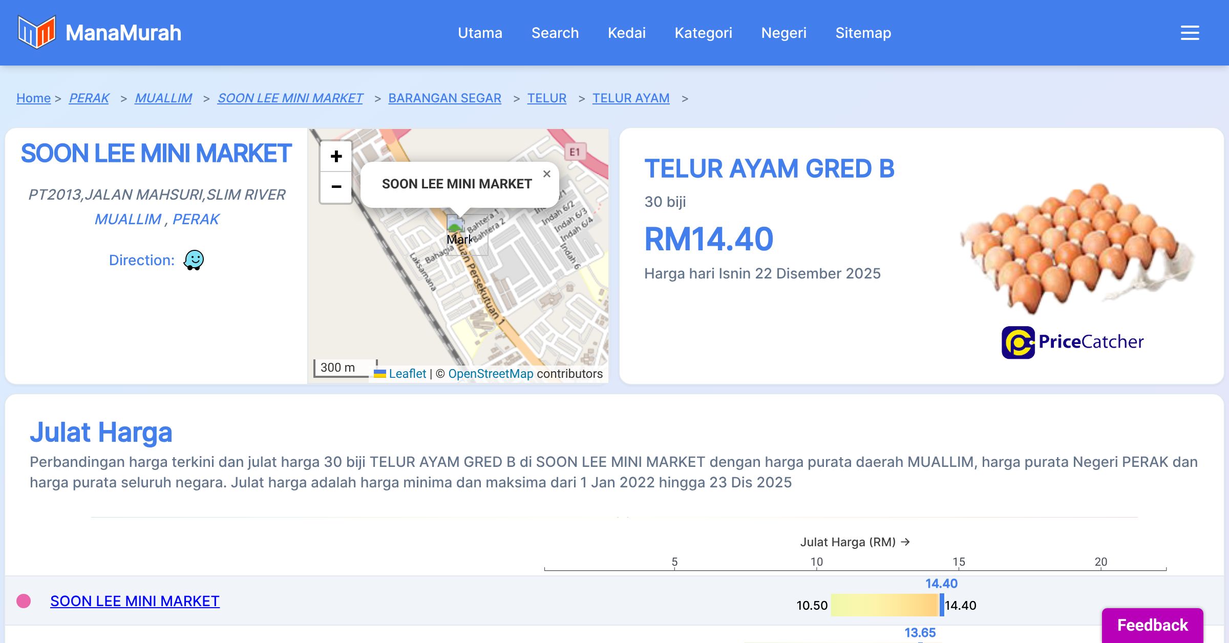 Perbandingan harga terkini dan julat harga 30 biji TELUR AYAM GRED B di SOON LEE MINI MARKET dengan harga purata daerah MUALLIM, harga purata Negeri PERAK dan harga purata seluruh negara. Julat harga adalah harga minima dan maksima dari 1 Jan 2022 hingga 23 Dis 2025
