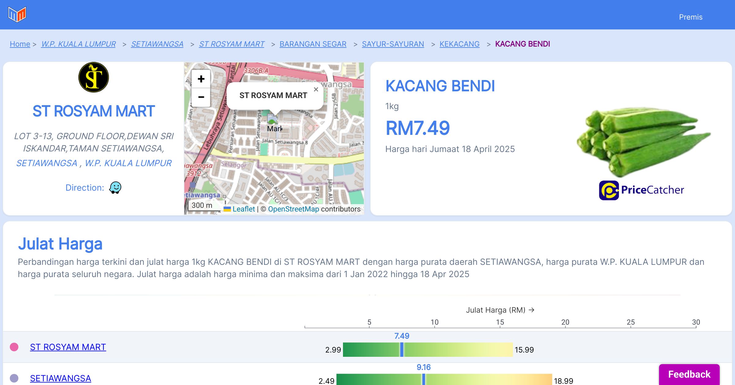 Perbandingan harga terkini dan julat harga 1kg KACANG BENDI di ST ROSYAM MART dengan harga purata daerah SETIAWANGSA, harga purata W.P. KUALA LUMPUR dan harga purata seluruh negara. Julat harga adalah harga minima dan maksima dari 1 Jan 2022 hingga 14 Dis 2025