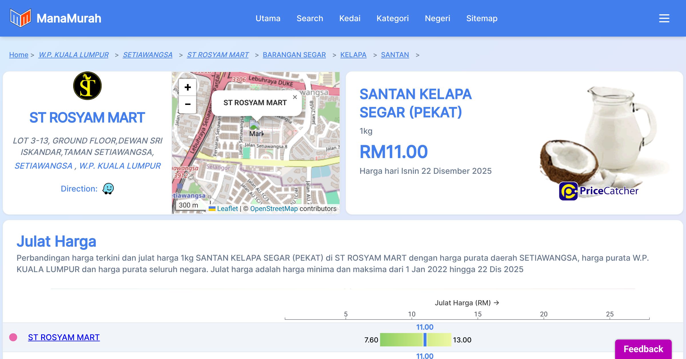 Perubahan harga purata mingguan 1kg SANTAN KELAPA SEGAR (PEKAT) di ST ROSYAM MART berbanding harga purata mingguan daerah SETIAWANGSA, harga purata mingguan negeri W.P. KUALA LUMPUR dan harga purata mingguan seluruh negara sehingga 22 Dis 2025
