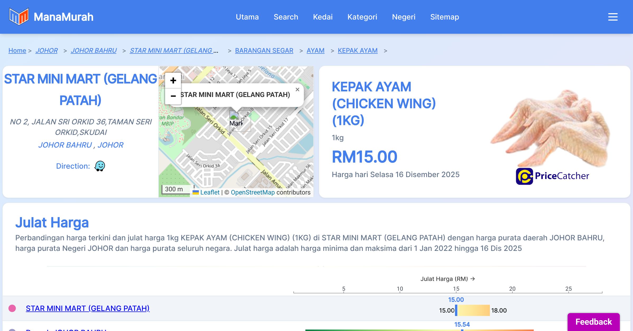 Perbandingan harga terkini dan julat harga 1kg KEPAK AYAM (CHICKEN WING) (1KG) di STAR MINI MART (GELANG PATAH) dengan harga purata daerah JOHOR BAHRU, harga purata Negeri JOHOR dan harga purata seluruh negara. Julat harga adalah harga minima dan maksima dari 1 Jan 2022 hingga 16 Dis 2025