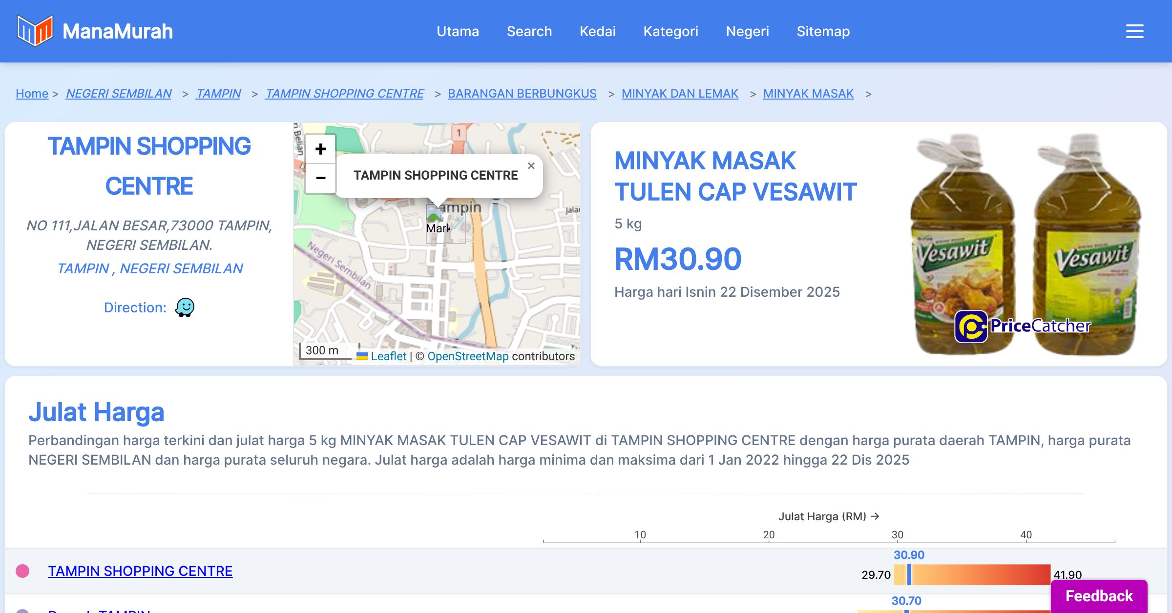 Perubahan harga purata mingguan 5 kg MINYAK MASAK TULEN CAP VESAWIT di TAMPIN SHOPPING CENTRE berbanding harga purata mingguan daerah TAMPIN, harga purata mingguan negeri NEGERI SEMBILAN dan harga purata mingguan seluruh negara sehingga 22 Dis 2025