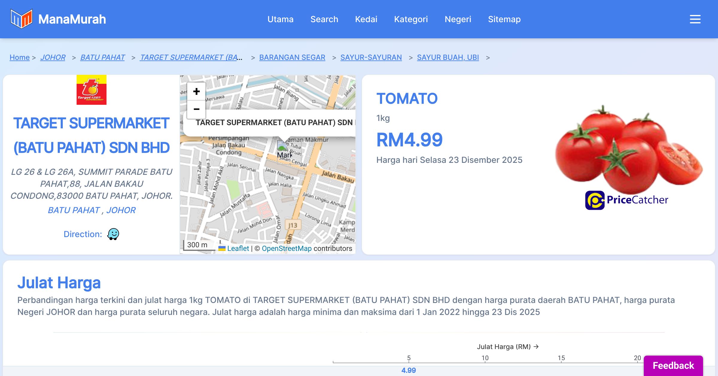 Perbandingan harga terkini dan julat harga 1kg TOMATO di TARGET SUPERMARKET (BATU PAHAT) SDN BHD dengan harga purata daerah BATU PAHAT, harga purata Negeri JOHOR dan harga purata seluruh negara. Julat harga adalah harga minima dan maksima dari 1 Jan 2022 hingga 23 Dis 2025