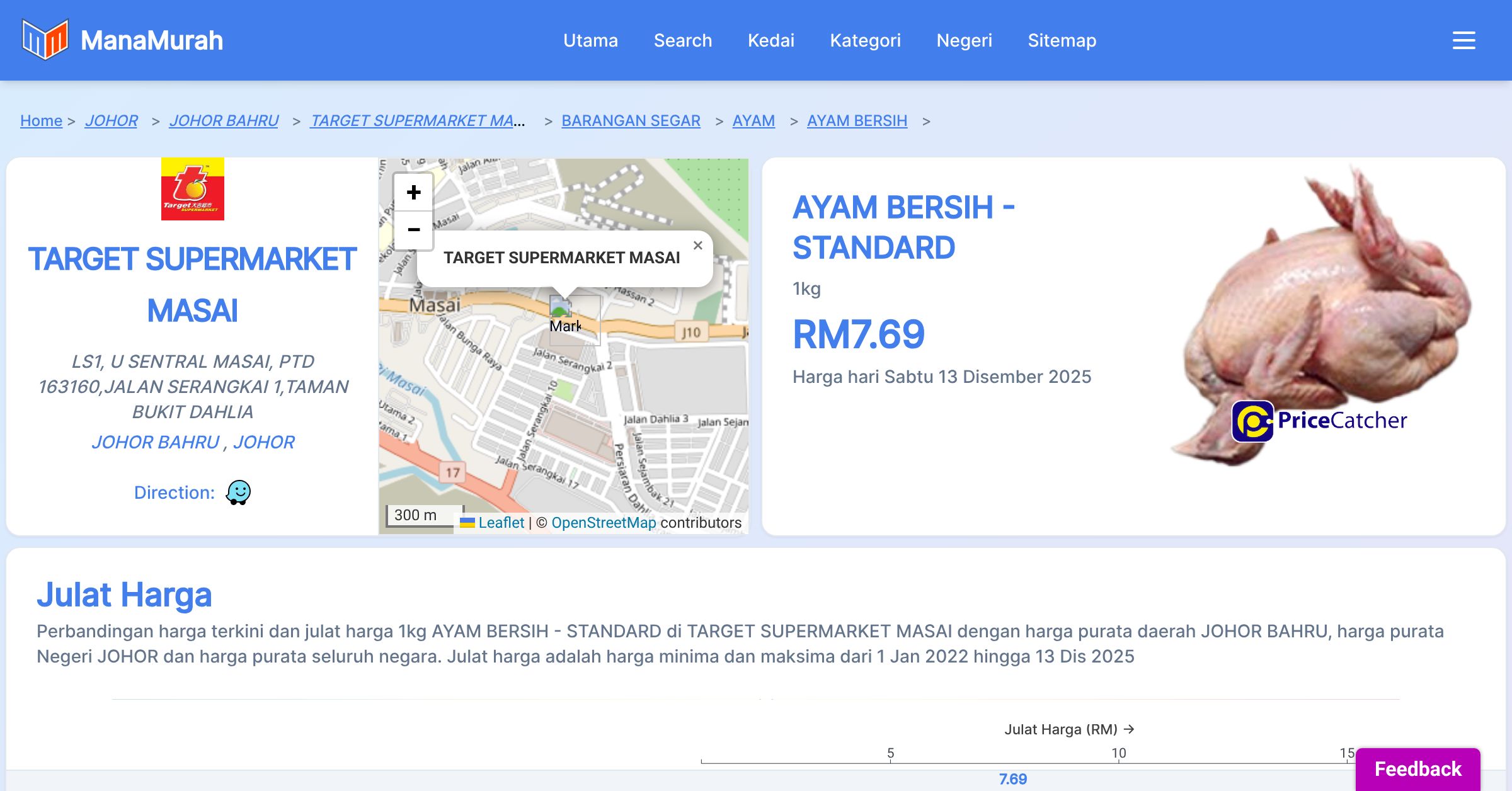 Harga purata mingguan 1kg AYAM BERSIH - STANDARD di TARGET SUPERMARKET MASAI berbanding harga purata daerah JOHOR BAHRU, harga purata Negeri JOHOR dan harga purata seluruh negara