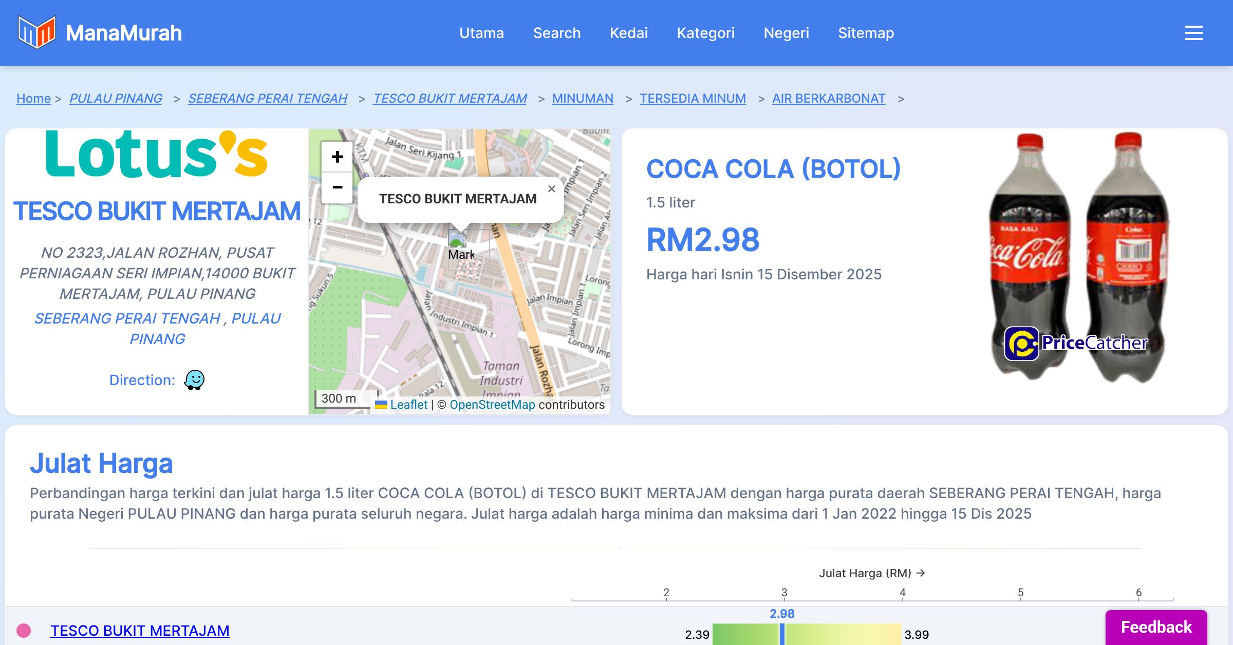 Perbandingan harga terkini dan julat harga 1.5 liter COCA COLA (BOTOL) di TESCO BUKIT MERTAJAM dengan harga purata daerah SEBERANG PERAI TENGAH, harga purata Negeri PULAU PINANG dan harga purata seluruh negara. Julat harga adalah harga minima dan maksima dari 1 Jan 2022 hingga 30 Mac 2026
