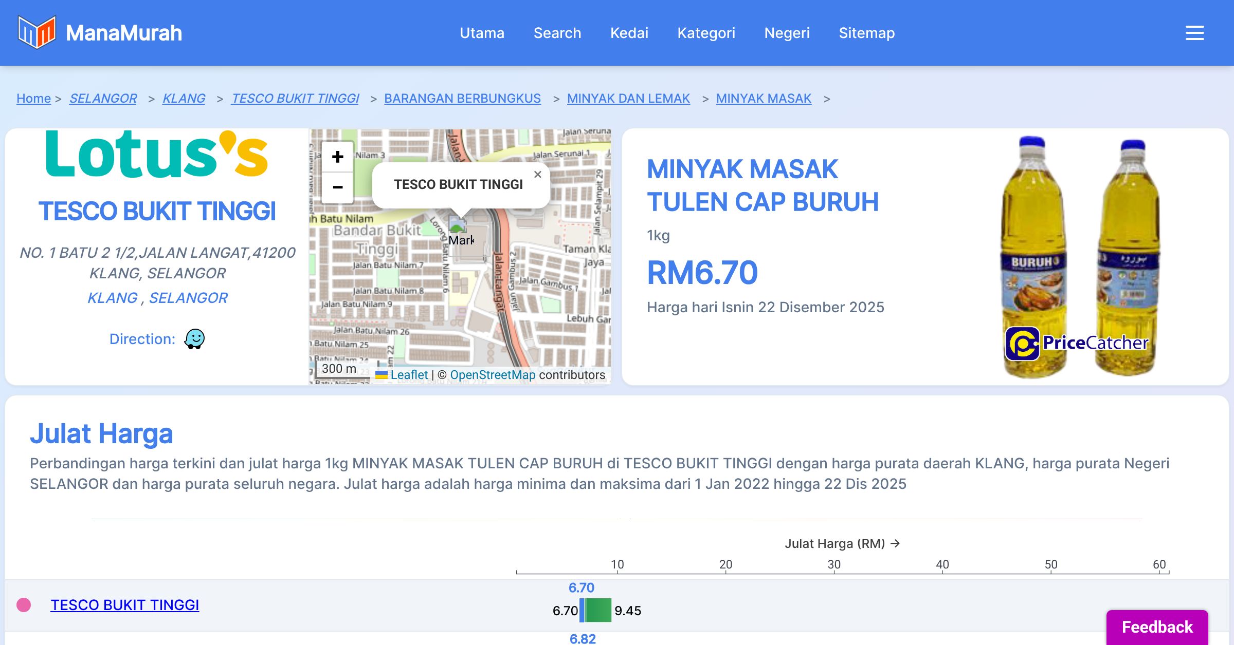Perubahan harga purata mingguan 1kg MINYAK MASAK TULEN CAP BURUH di TESCO BUKIT TINGGI berbanding harga purata mingguan daerah KLANG, harga purata mingguan negeri SELANGOR dan harga purata mingguan seluruh negara sehingga 22 Dis 2025