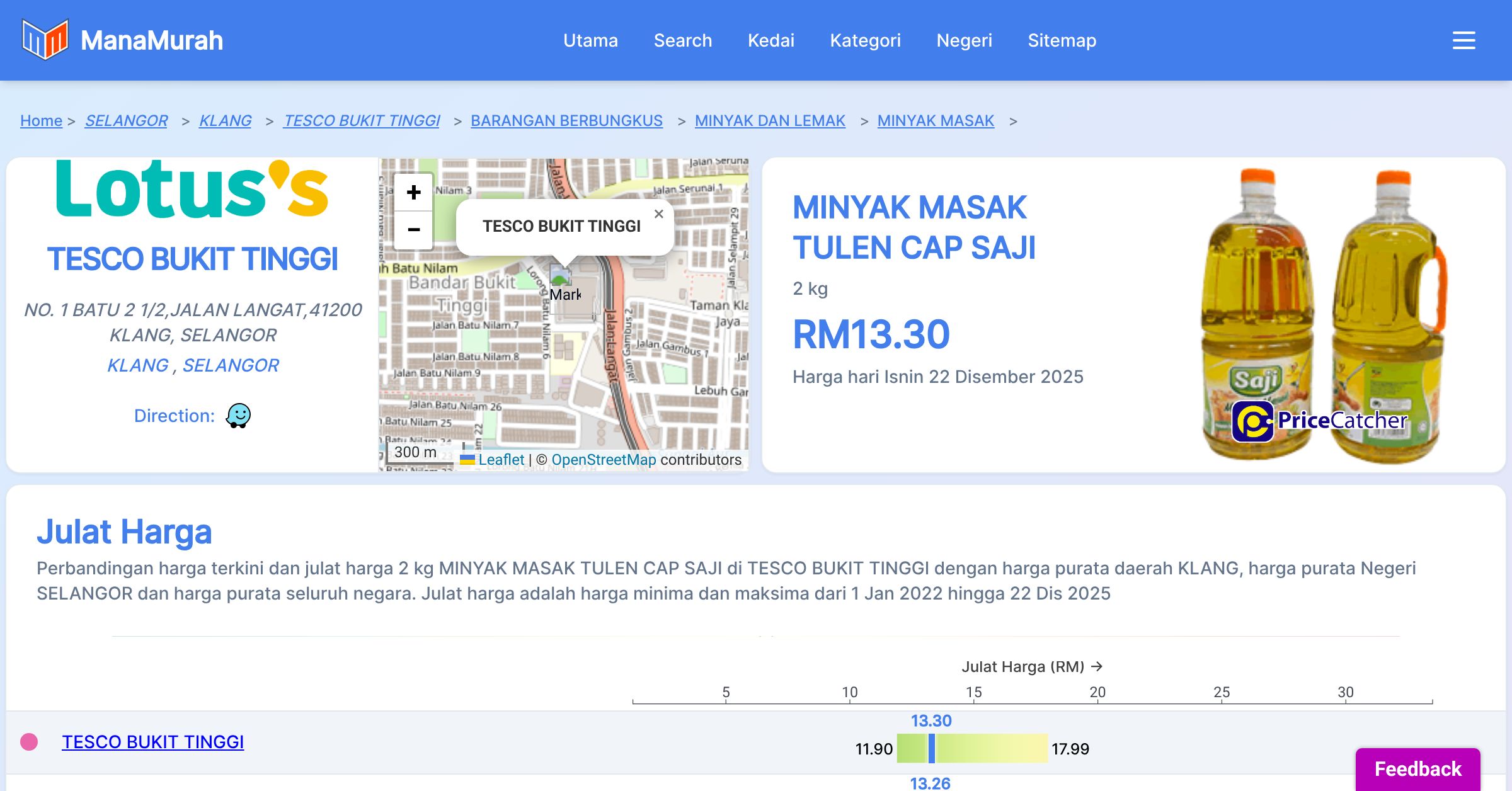 Perubahan harga purata mingguan 2 kg MINYAK MASAK TULEN CAP SAJI di TESCO BUKIT TINGGI berbanding harga purata mingguan daerah KLANG, harga purata mingguan negeri SELANGOR dan harga purata mingguan seluruh negara sehingga 22 Dis 2025