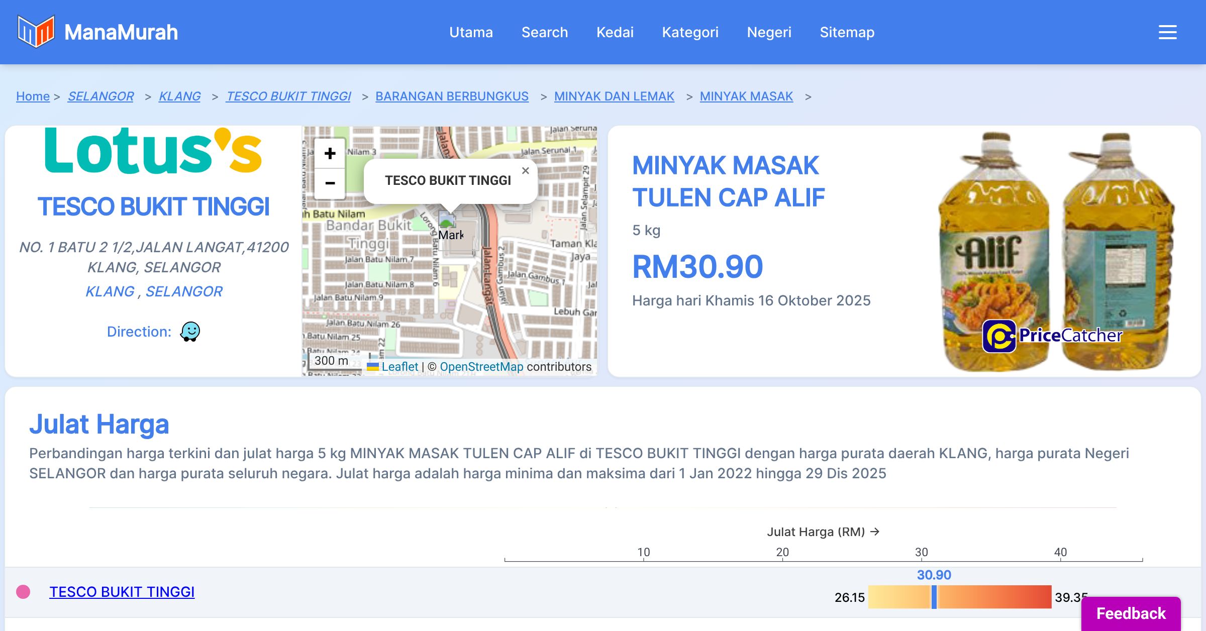 Tiada maklumat harga MINYAK MASAK TULEN CAP ALIF di Daerah KLANG pada 31 Disember 2025