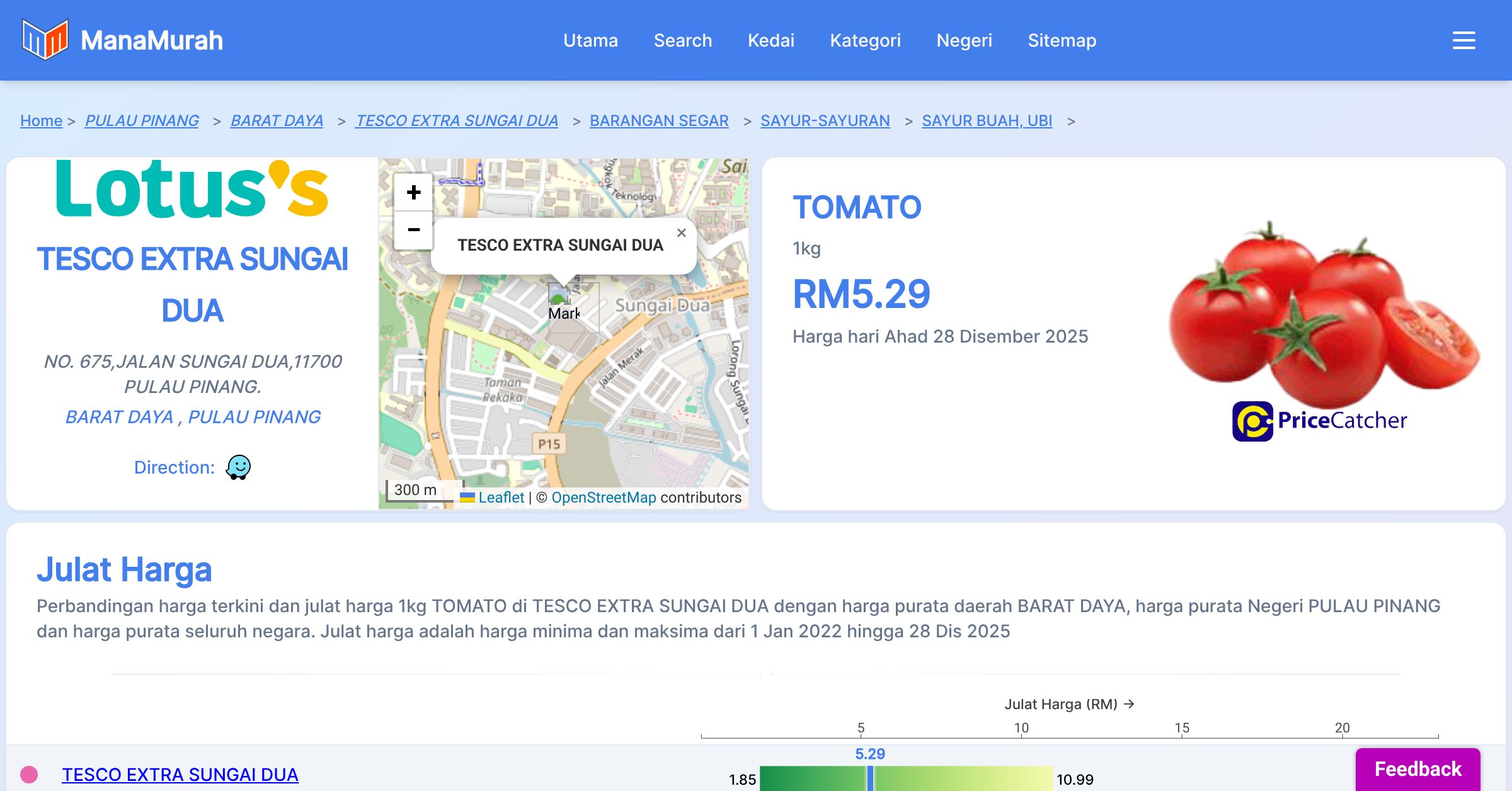 Harga purata tahunan 1kg TOMATO di TESCO EXTRA SUNGAI DUA berbanding harga purata daerah BARAT DAYA, harga purata Negeri PULAU PINANG dan harga purata seluruh negara