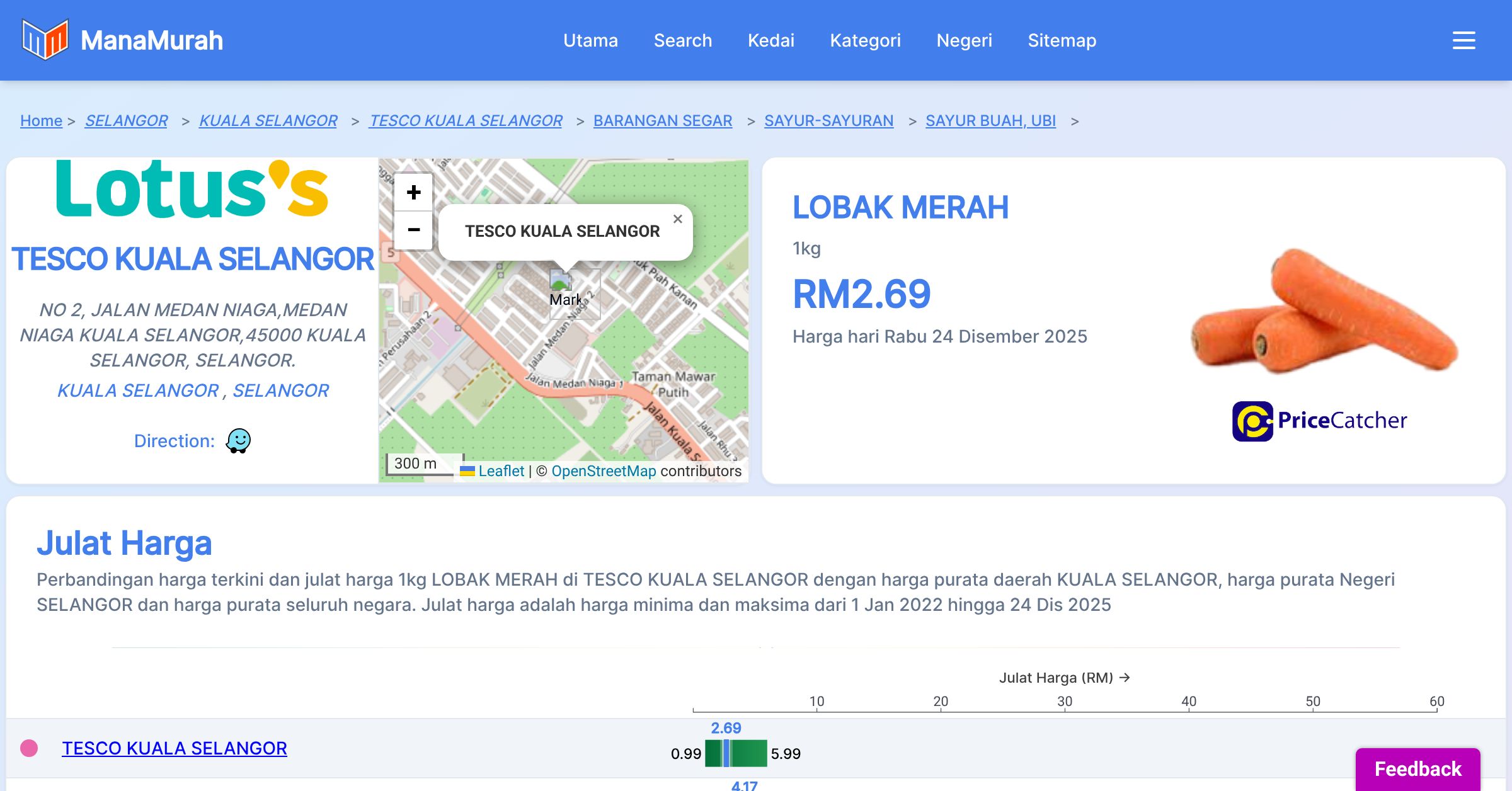 Perbandingan harga terkini dan julat harga 1kg LOBAK MERAH di TESCO KUALA SELANGOR dengan harga purata daerah KUALA SELANGOR, harga purata Negeri SELANGOR dan harga purata seluruh negara. Julat harga adalah harga minima dan maksima dari 1 Jan 2022 hingga 24 Dis 2025