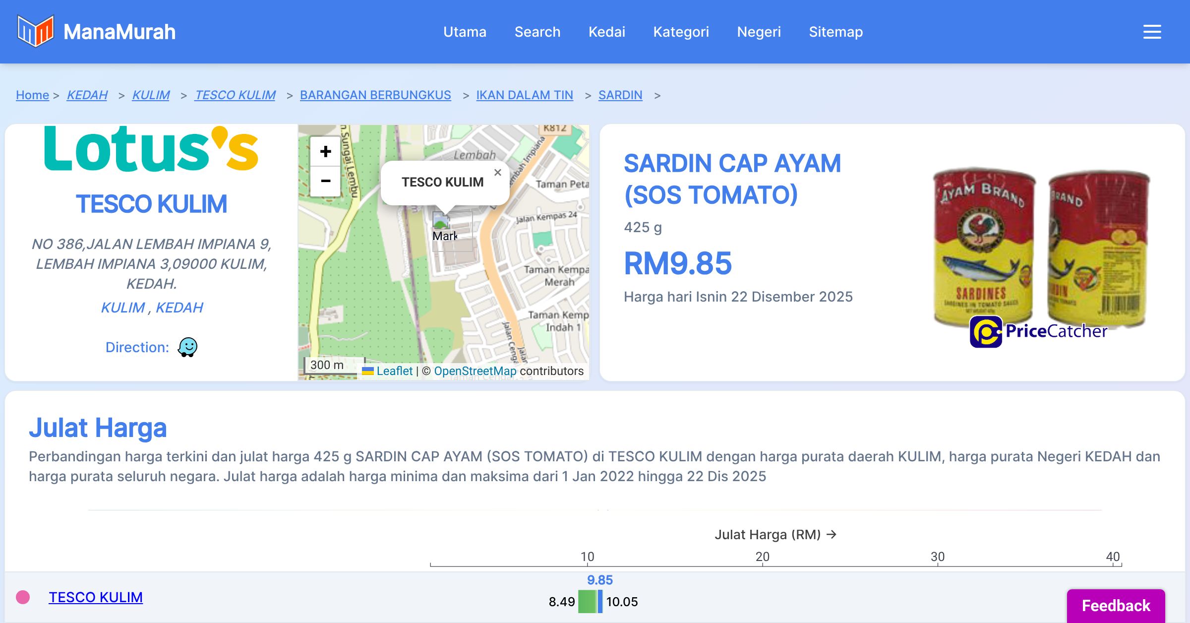 Perbandingan harga terkini dan julat harga 425 g SARDIN CAP AYAM (SOS TOMATO) di TESCO KULIM dengan harga purata daerah KULIM, harga purata Negeri KEDAH dan harga purata seluruh negara. Julat harga adalah harga minima dan maksima dari 1 Jan 2022 hingga 22 Dis 2025