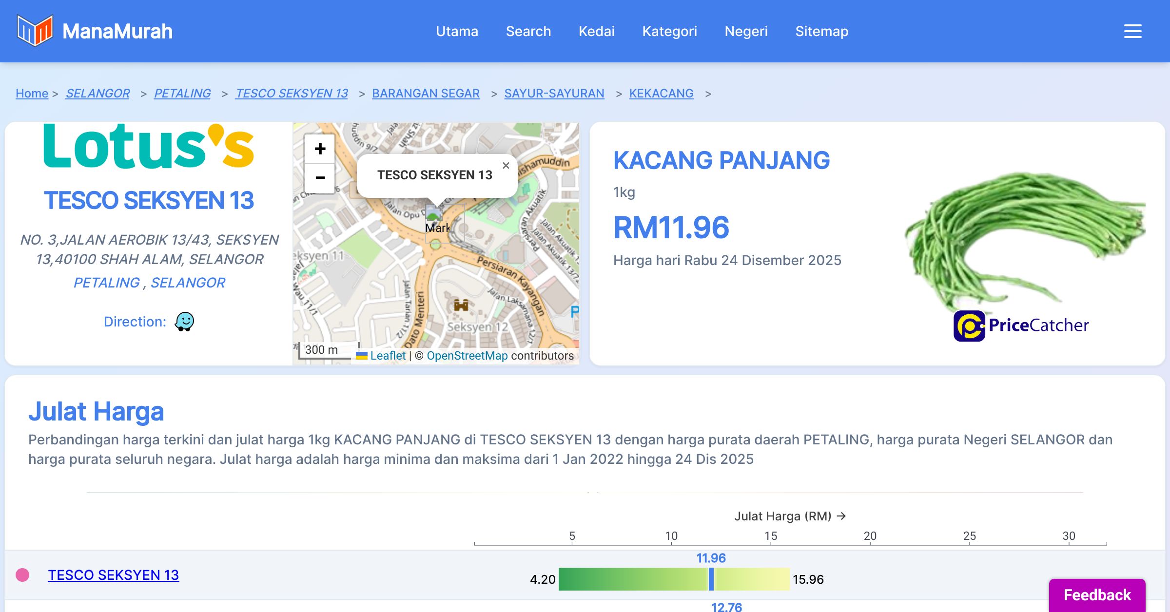Harga purata bulanan 1kg KACANG PANJANG di TESCO SEKSYEN 13 berbanding harga purata daerah PETALING, harga purata Negeri SELANGOR dan harga purata seluruh negara