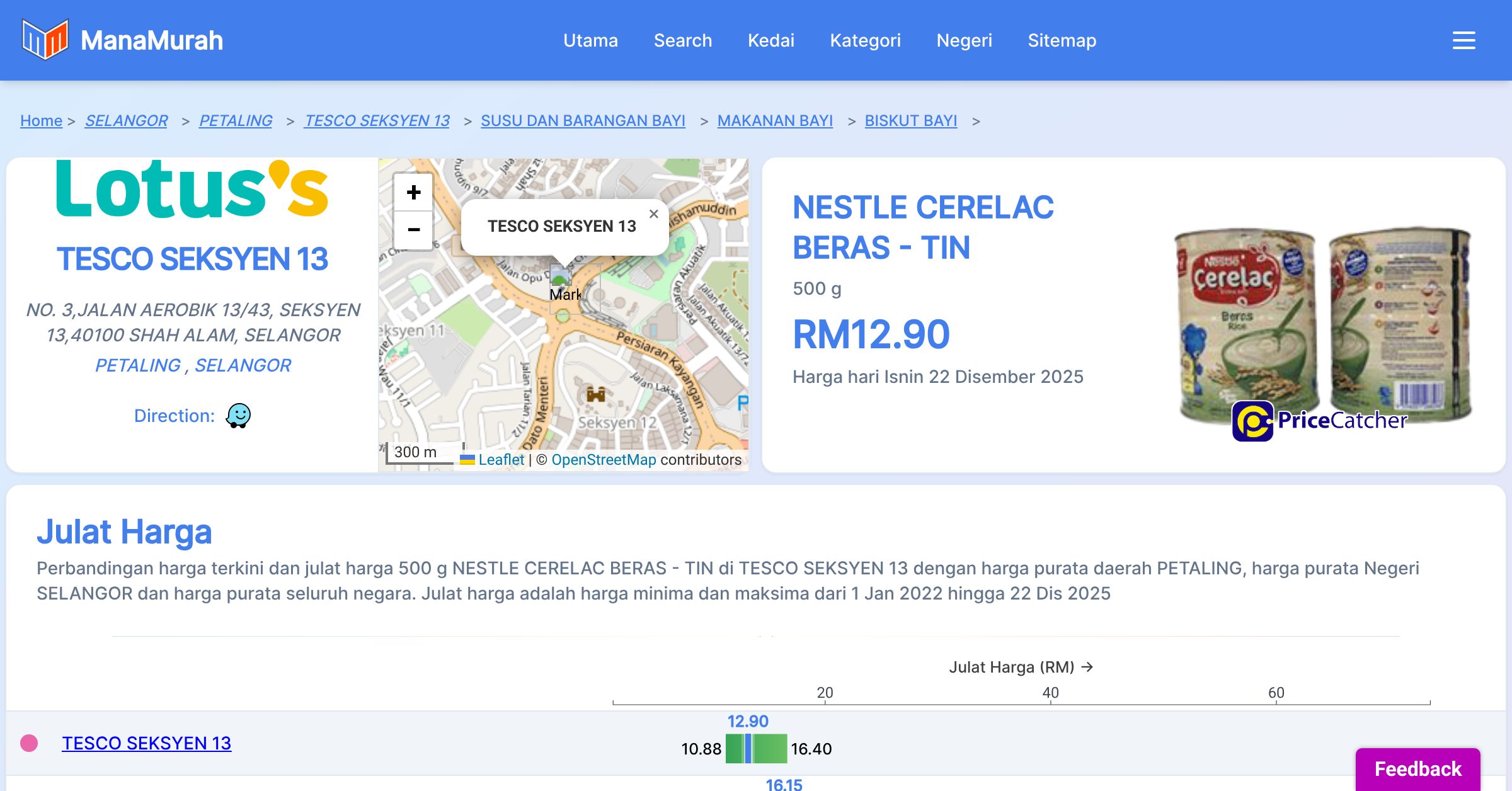 Perbandingan harga terkini dan julat harga 500 g NESTLE CERELAC BERAS - TIN di TESCO SEKSYEN 13 dengan harga purata daerah PETALING, harga purata Negeri SELANGOR dan harga purata seluruh negara. Julat harga adalah harga minima dan maksima dari 1 Jan 2022 hingga 22 Dis 2025