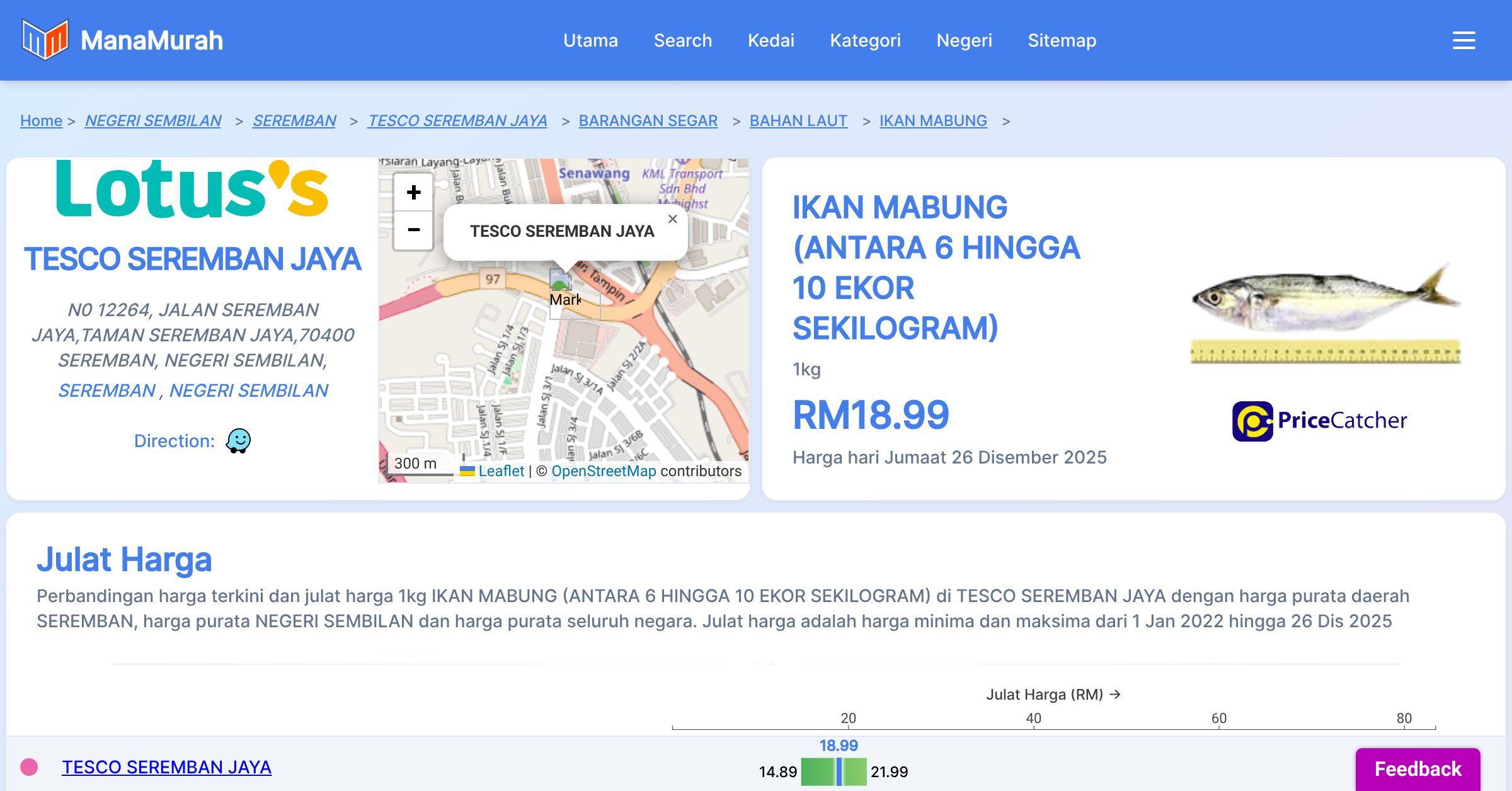 Perubahan harga purata mingguan 1kg IKAN MABUNG (ANTARA 6 HINGGA 10 EKOR SEKILOGRAM) di TESCO SEREMBAN JAYA berbanding harga purata mingguan daerah SEREMBAN, harga purata mingguan negeri NEGERI SEMBILAN dan harga purata mingguan seluruh negara sehingga 26 Dis 2025