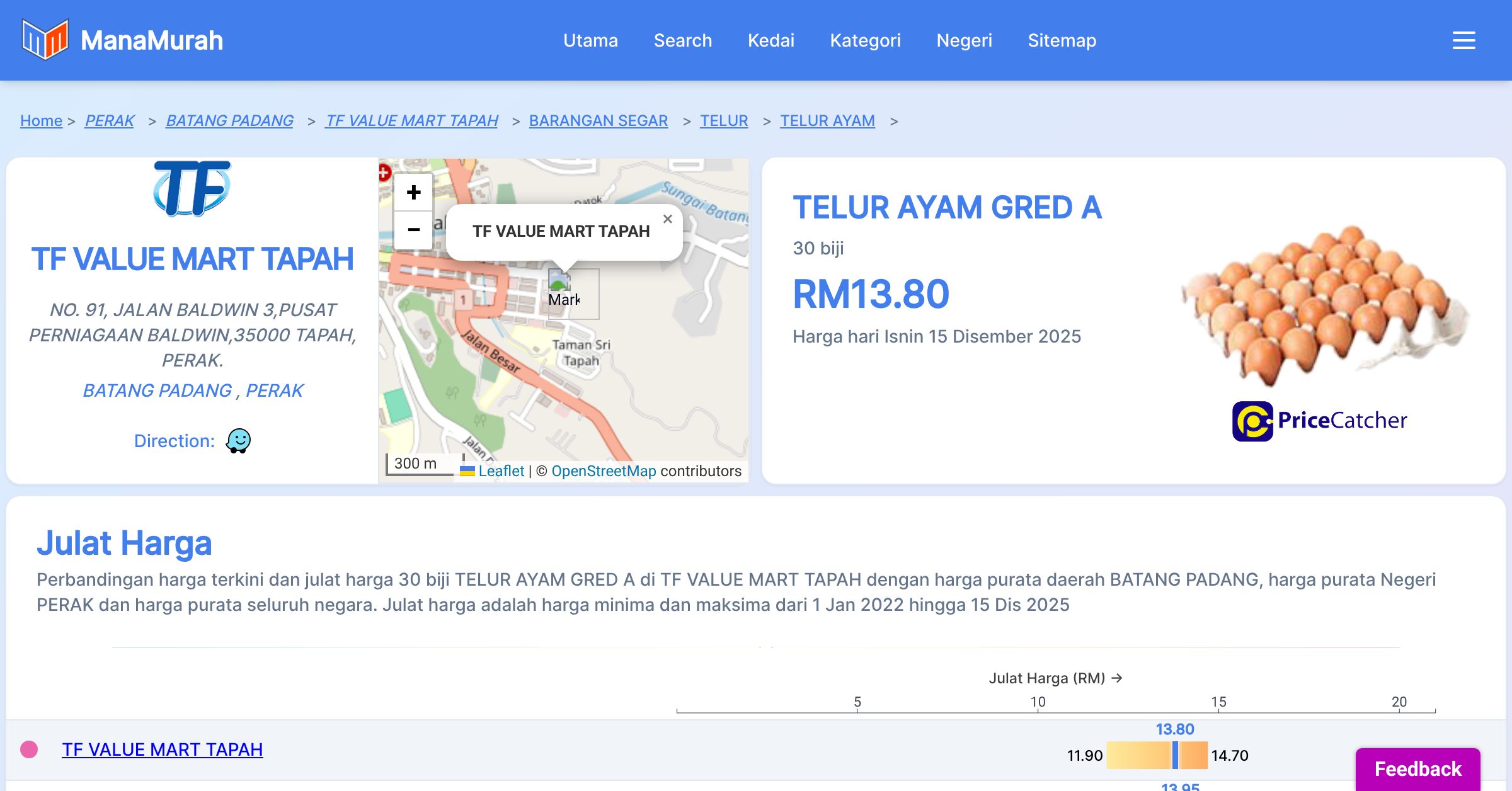 Perbandingan harga terkini dan julat harga 30 biji TELUR AYAM GRED A di TF VALUE MART TAPAH dengan harga purata daerah BATANG PADANG, harga purata Negeri PERAK dan harga purata seluruh negara. Julat harga adalah harga minima dan maksima dari 1 Jan 2022 hingga 14 Dis 2025