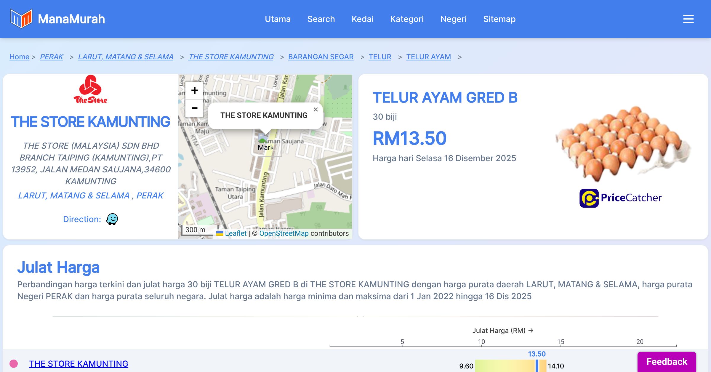 Perbandingan harga terkini dan julat harga 30 biji TELUR AYAM GRED B di THE STORE KAMUNTING dengan harga purata daerah LARUT, MATANG & SELAMA, harga purata Negeri PERAK dan harga purata seluruh negara. Julat harga adalah harga minima dan maksima dari 1 Jan 2022 hingga 16 Dis 2025