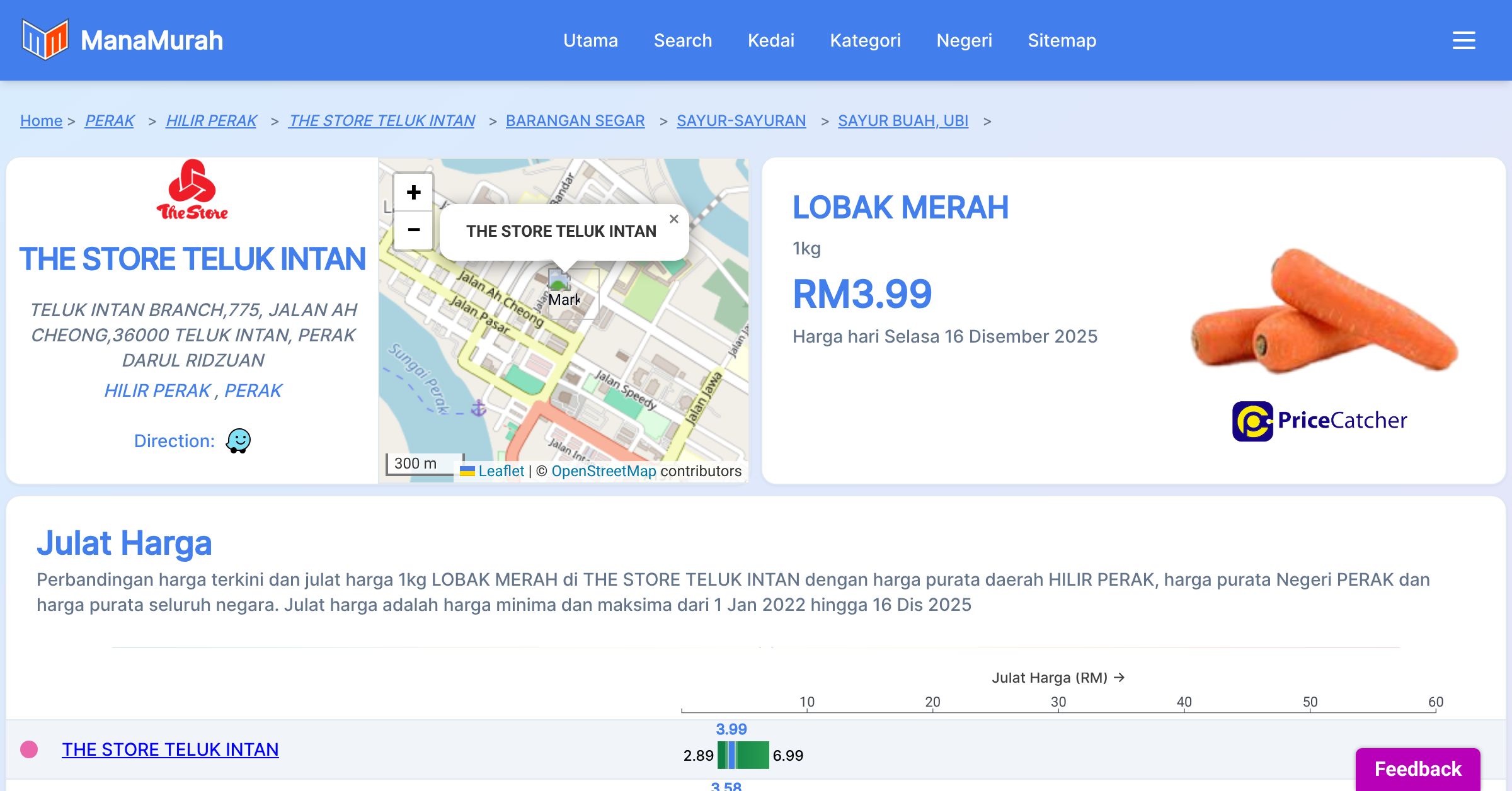 Harga purata tahunan 1kg LOBAK MERAH di THE STORE TELUK INTAN berbanding harga purata daerah HILIR PERAK, harga purata Negeri PERAK dan harga purata seluruh negara