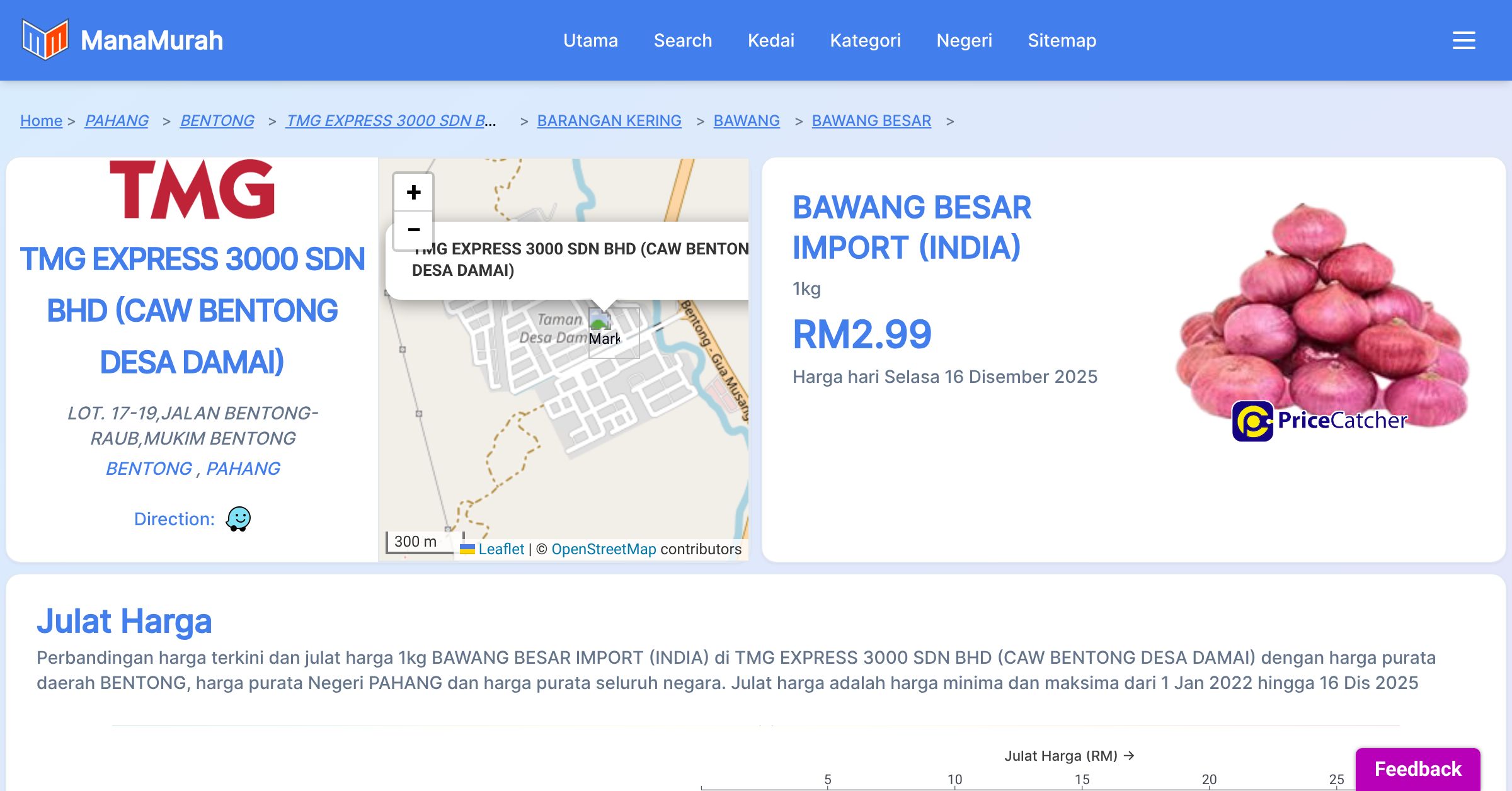 Perubahan harga purata mingguan 1kg BAWANG BESAR IMPORT (INDIA) di TMG EXPRESS 3000 SDN BHD (CAW BENTONG DESA DAMAI) berbanding harga purata mingguan daerah BENTONG, harga purata mingguan negeri PAHANG dan harga purata mingguan seluruh negara sehingga 16 Dis 2025