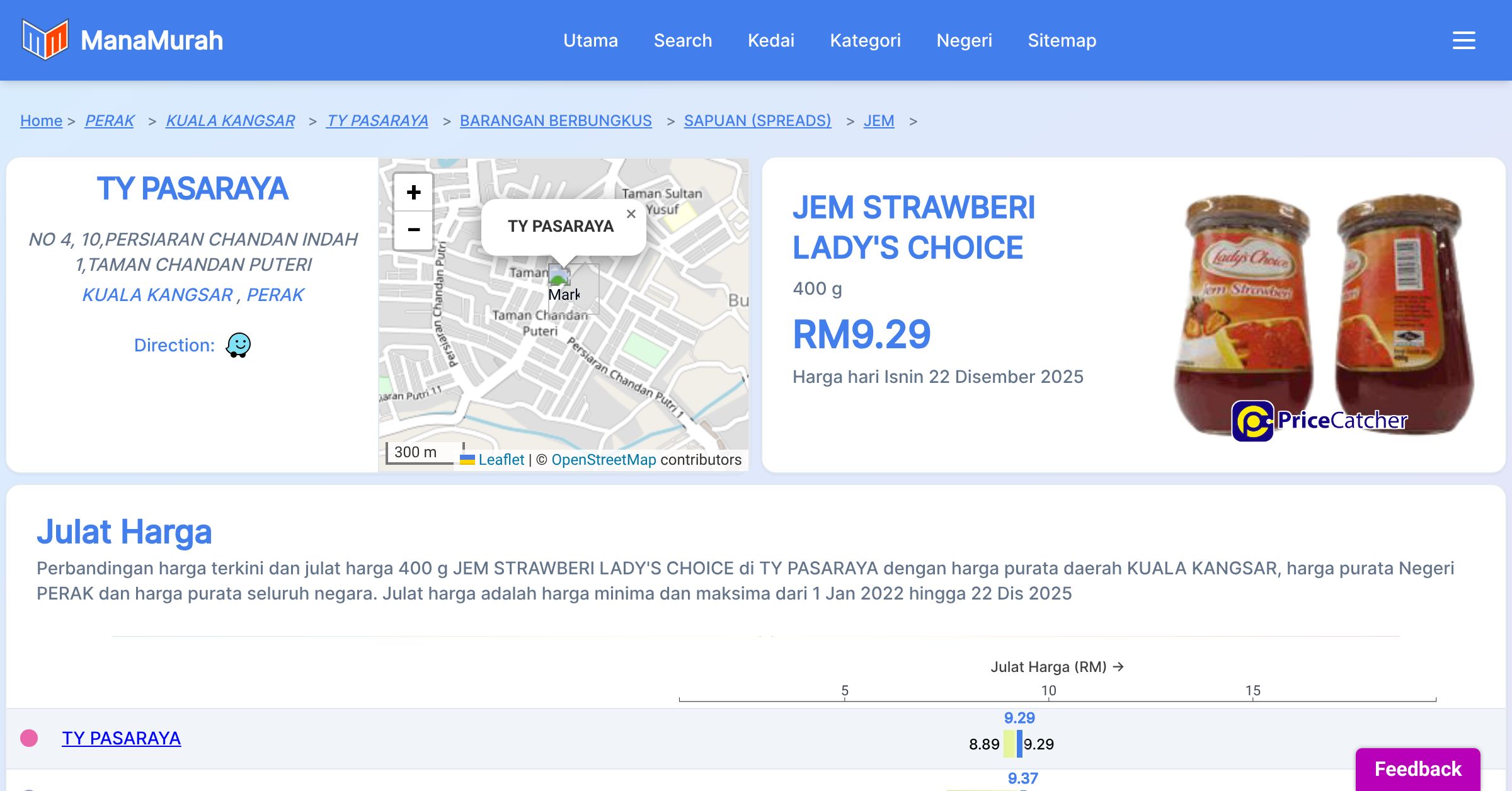 Perbandingan harga terkini dan julat harga 400 g JEM STRAWBERI LADY'S CHOICE di TY PASARAYA dengan harga purata daerah KUALA KANGSAR, harga purata Negeri PERAK dan harga purata seluruh negara. Julat harga adalah harga minima dan maksima dari 1 Jan 2022 hingga 22 Dis 2025